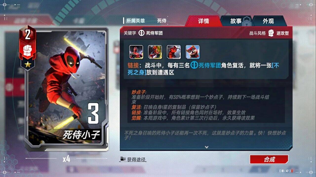 <被动>:战斗中我方最左侧的角色被摧毁时,随机召唤一个同费用的<支援型>角色并为其佩戴一件合适的装备,每场战斗可以触发两次