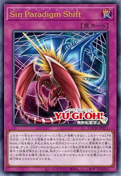 这个卡名的卡在1回合只能发动1张。这张卡也能将基本分支付一半从手牌发动。 ①:从自己的卡组·墓地选1张「Sin 世界」加入手牌或在自己的场地区域表侧表示放置。那之后,从卡组·额外卡组将1只「Sin」怪兽无视召唤条件守备表示特殊召唤。那之后,对手场上有攻击力2500以上的怪兽存在的情况下,对手场上的全部的怪兽的攻击力直到回合结束时下降2500。