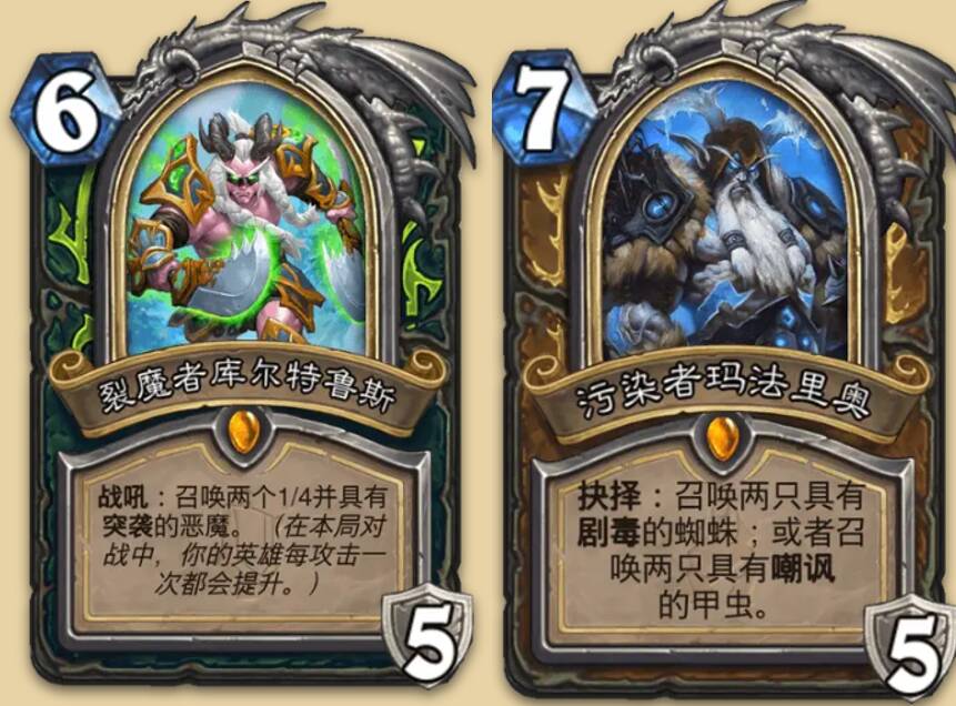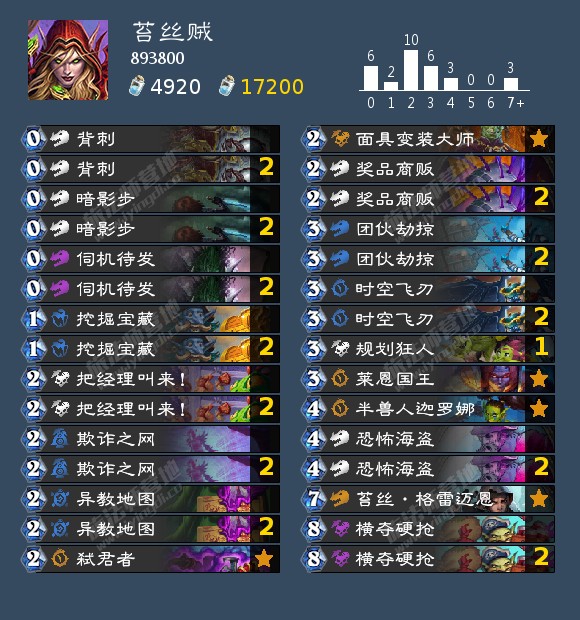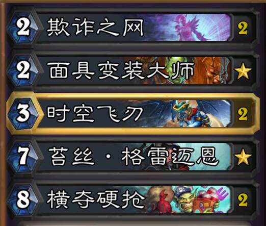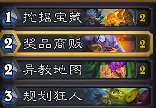 过牌组件,这就是这套牌里能用上的最好的几张过牌了。1费定向检索,弑君只能抽上来三张传说的两张,这卡能捞苔丝或是面具,也能存费/加快过牌;奖品商贩2费过2,配合弑君者可以爆对面牌;这套牌里的低费卡很多,异教地图会有很好的发挥;规划狂人是唯一的摇摆组件,之前我抄的卡组里带的是虚灵神谕者,我测试下来后选择了规划狂人。一般打这个费用去过牌多半是马上要去找最后的组件或者横夺硬抢救命了,虚灵虽然能用暗影步配合偷费用,但还是不够稳定。因为这几张过牌都是