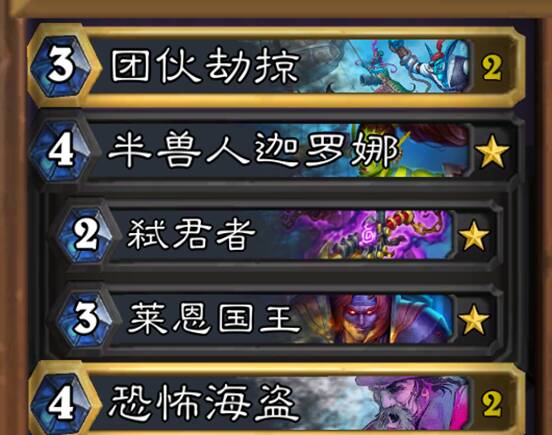 弑君奇闻组件,理想情况下起手伺机待发团伙劫掠直接过3,弑君砍两次和恐怖海盗是润滑节奏、撑过前期的重要保障。弑君的定向检索作用不必多说,第二张团伙劫掠虽然没用,但可以在启动后配合苔丝的伺机待发随便卸下去。