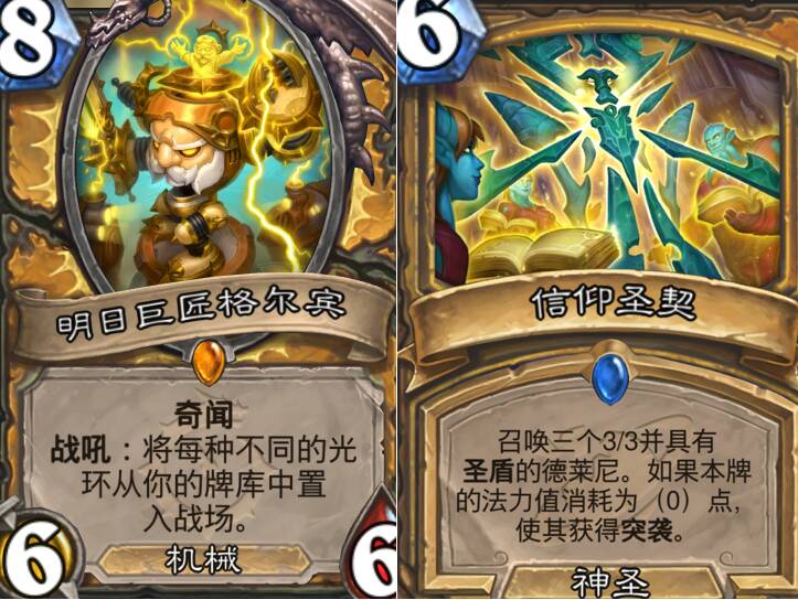 骑士:圣契光环或者纯光环。快攻骑我们碰到基本包死,但也不多,所以也不需要讨论了。纯光环大优,这个局对面很尴尬,除非跳费顺利或者人偶大师过上来了1费明日巨匠格尔宾,否则对面启动的时候也正好是我们横抢硬夺/苔丝发力的时候,对面不仅站不住,还要额外想办法处理苔丝的战场。圣契光环小优,但主要还是看启动速度,我们倒是不怕后期下大怪,主要是怕我们启动前突然三个圣盾德莱尼,很难处理。可叠甲可不叠,看具体情况