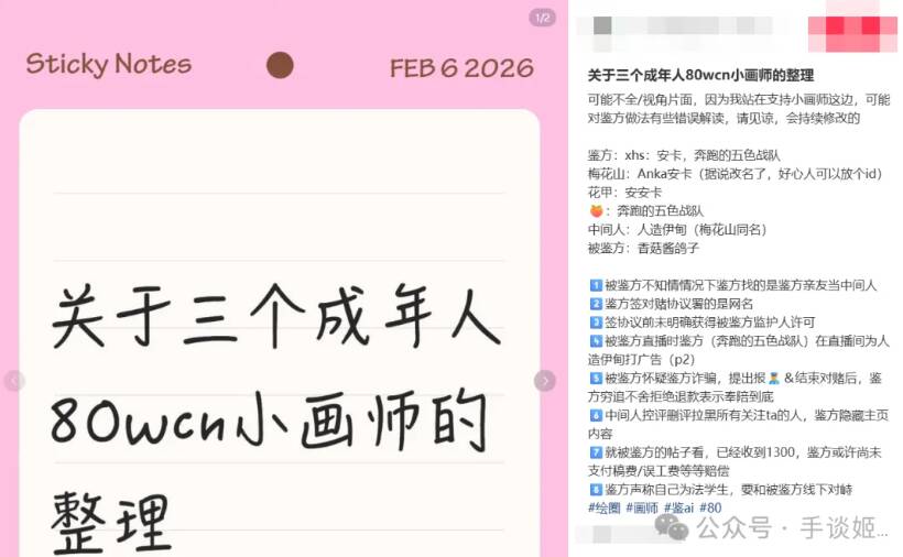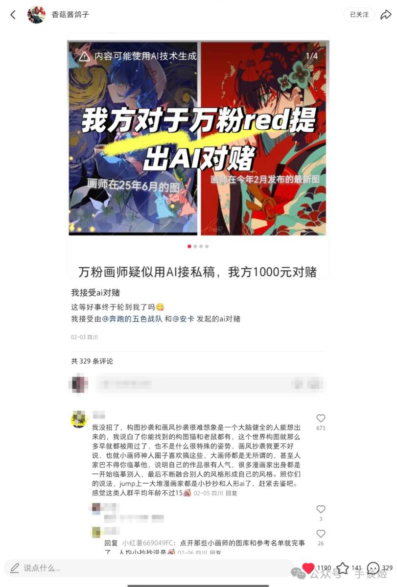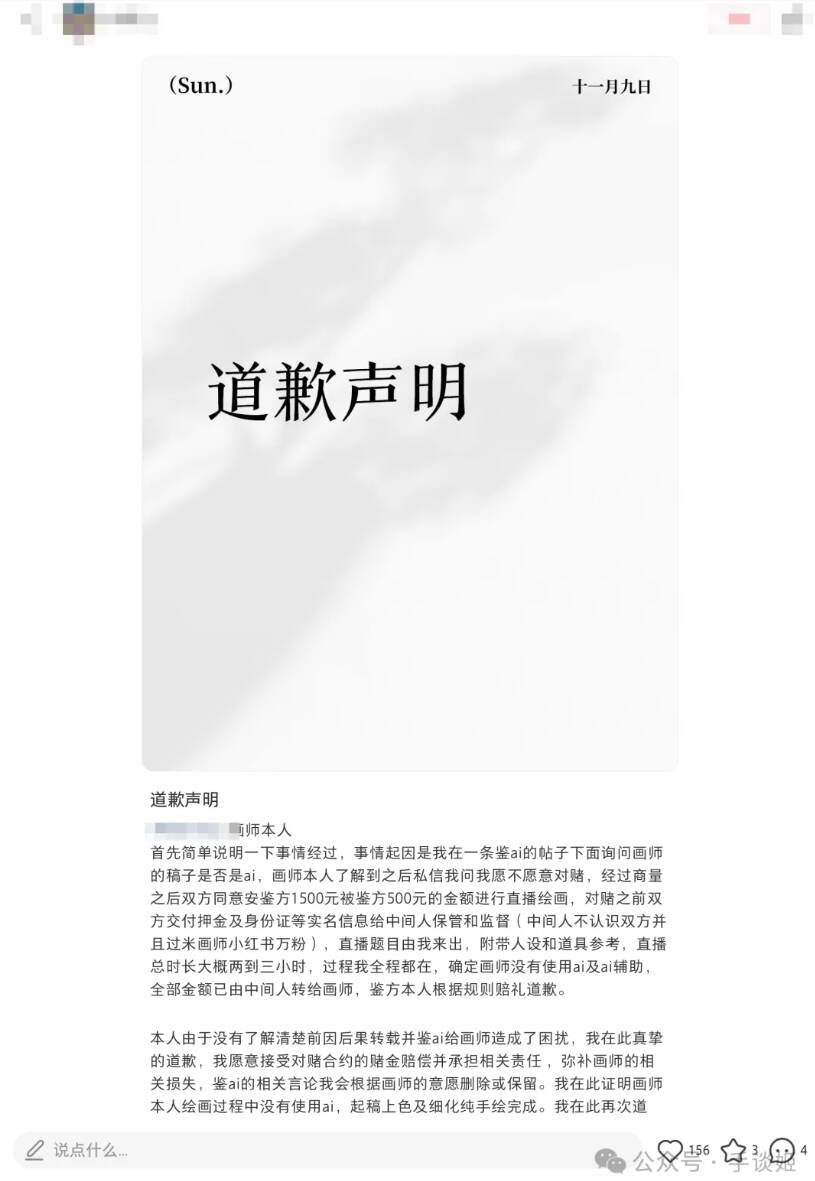 而被质疑的画师们却几乎只能被动应战。要么接受对赌、承担时间与心理成本;要么拒绝回应,被默认为“心虚”。所谓的自证清白逐渐演变为一种强制性的表演义务。更有甚者,将鉴定AI变成了己方聚众霸凌的牺牲品。