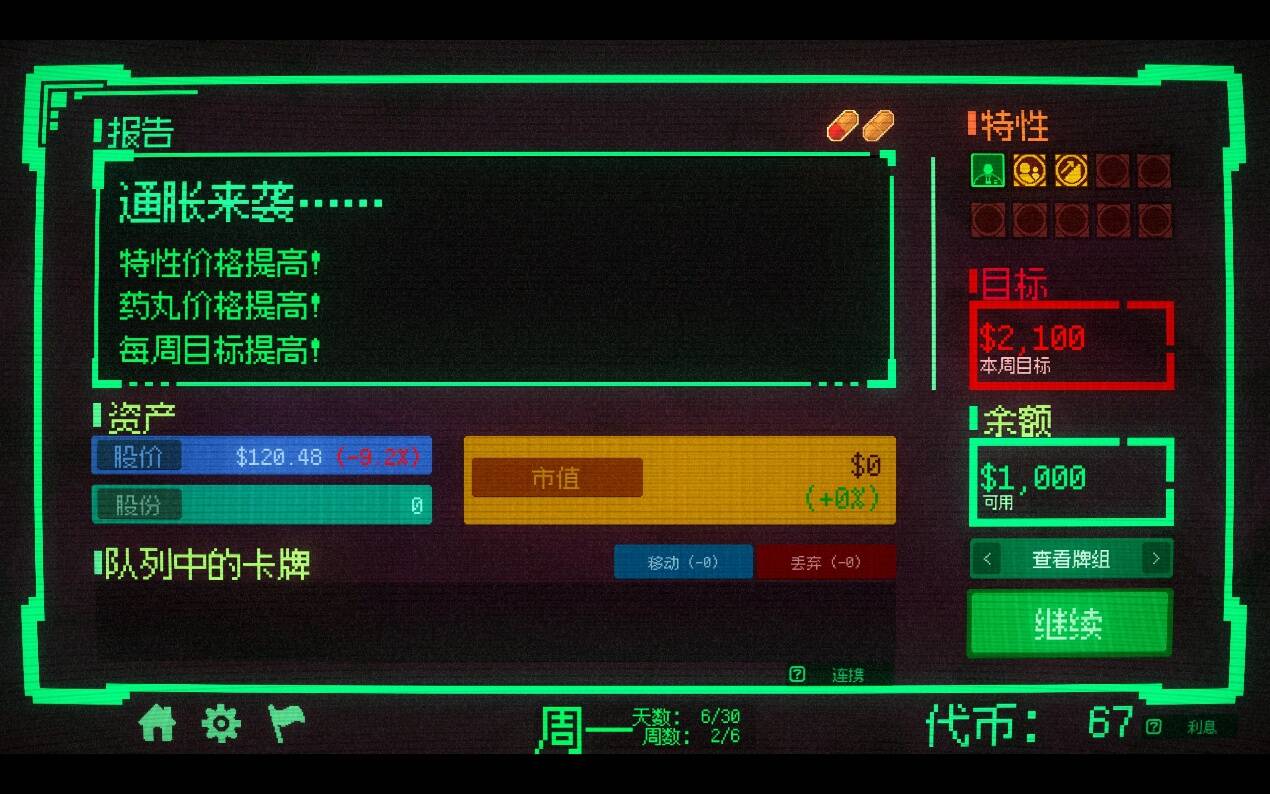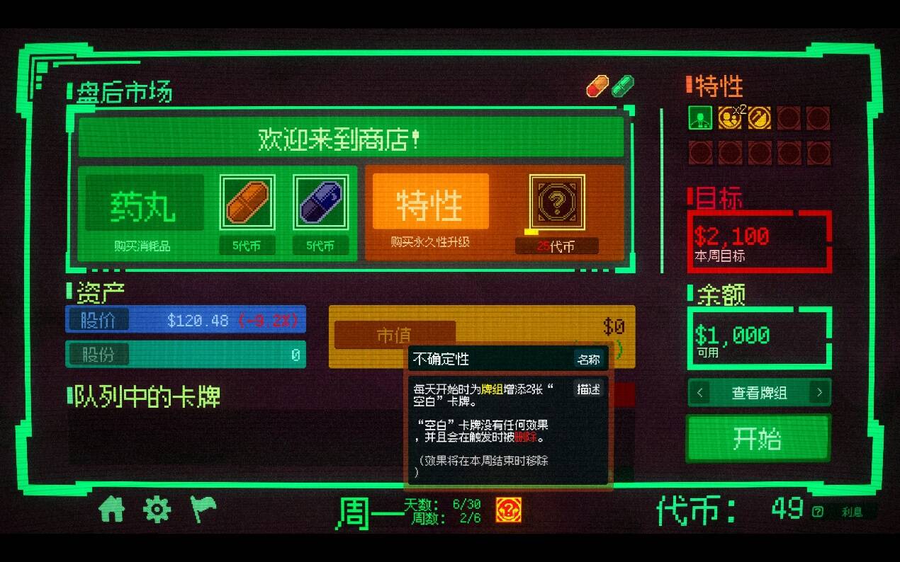 在每一天后,玩家通过赚取代比来获取强化效果。一个比较大胆的设计是,游戏中目前的强化效果均可重复获取,并只占据一个“特性”栏位,因此游戏中后期玩家能轻松体验到“股神”看着数字飞涨的快感。此外,在每一周中,还会有特殊的事件来调控玩家的策略。