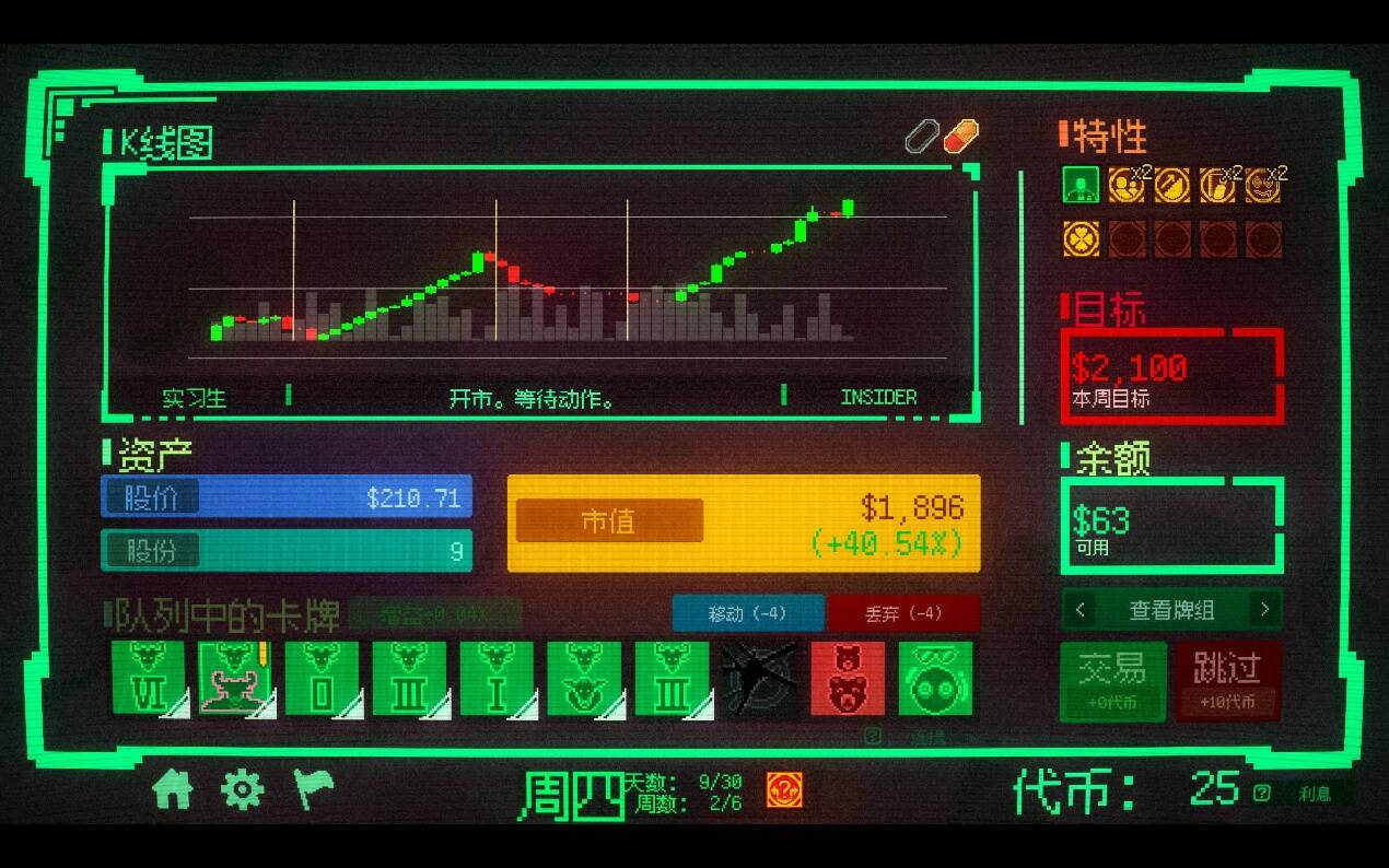 首先看结论,作为一款同时构筑增涨和削弱效果的肉鸽游戏,《内幕交易》很好的同时开发了“买入”和“卖出”两个角度,要求玩家既要促使股价上升来完成目标,又要通过控制买入价格来获得更大的收入,实现了全新的策略模式。由于允许玩家跳过单日来调整股价,整个作品在策略深度上有着极大的挖掘空间。