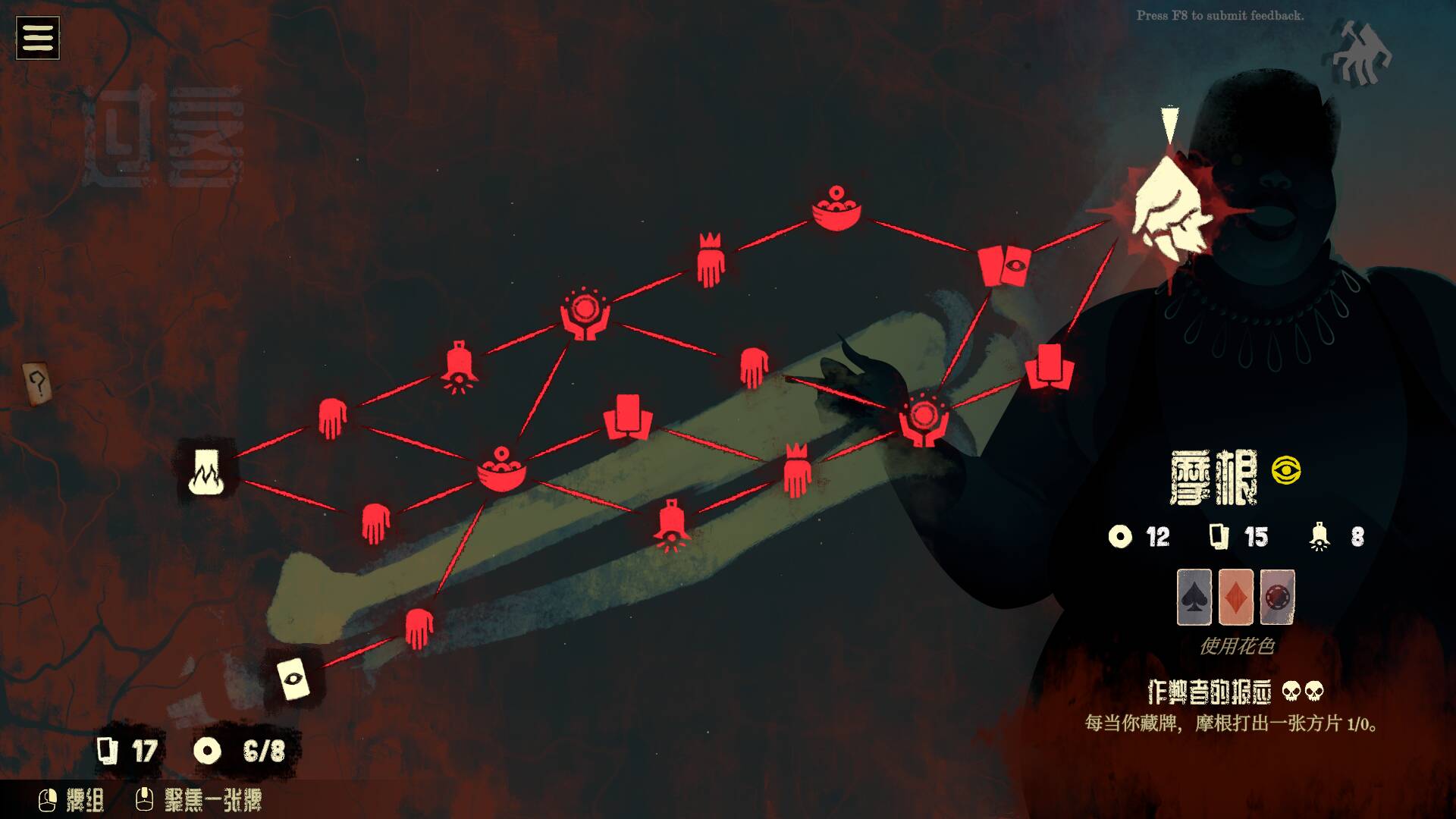 Demo版有三个BOSS,前两个BOSS是摩根和尼夫。摩根的技能是“作弊者的报应”,每轮对战会随机获得其中一个技能,要么耗尽你所有藏入袖子的牌,要么你每藏一张,他就打一张方片1(数值为1或0)。