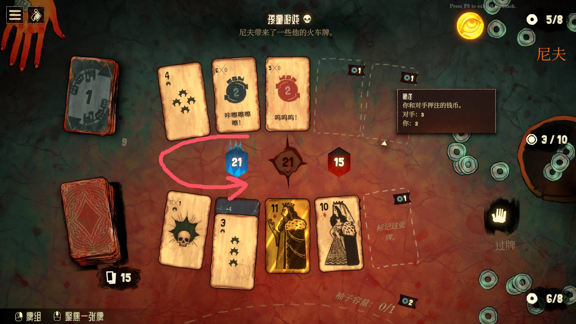 爆牌其实没那么可怕。超过21点你会被强制停牌、可能损失点币,虽然在这游戏里,币就是命,但牌组还在,下回合还能补救。真正致命的是你不知道对面下一步要干什么——黑桃牌会把“颓废”“背叛”这些诅咒牌洗进你牌库顶,红桃破损后全是负值,梅花可以直接把你手上的牌弃光。你会发现这游戏的进攻逻辑不是“我怎么赢”,而是“我怎么让你没法赢”。