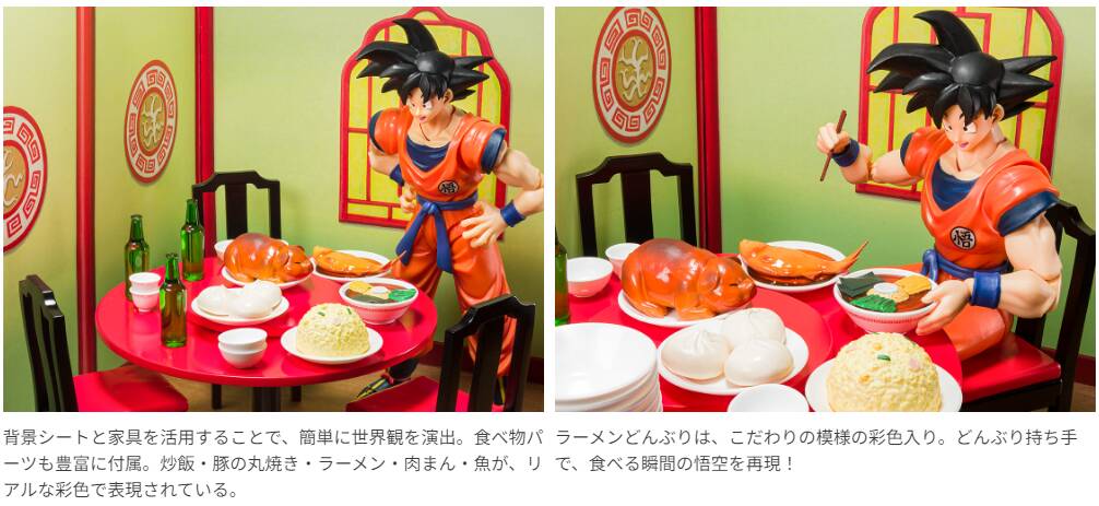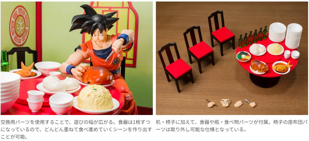 机・椅子に加えて、豊富な食事や食器パーツ、背景シートが付属し、この商品1つで世界観を表現可能。 別売りの「S.H.Figuarts 孫悟空-地球育ちのサイヤ人-」に使える交換用のもぐもぐ頬張る表情パーツ、箸やフォーク・どんぶりを持つ手首パーツで、遊びの幅が広がる!