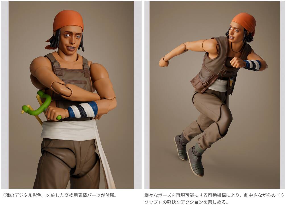 勇敢な海の戦士に憧れ、麦わらの一味の狙撃手を担う「ウソップ」をアクションフィギュアシリーズS.H.Figuartsで立体化!躍動感のあるポージングが楽しめる可動機構や、劇中さながらの衣装造形と、「魂のデジタル彩色」によるリアルな表情再現により、実写版の『ワンピース』の世界観を楽しむことができる。同シリーズの「チョッパー」(別売り)用の交換用表情パーツも付属。