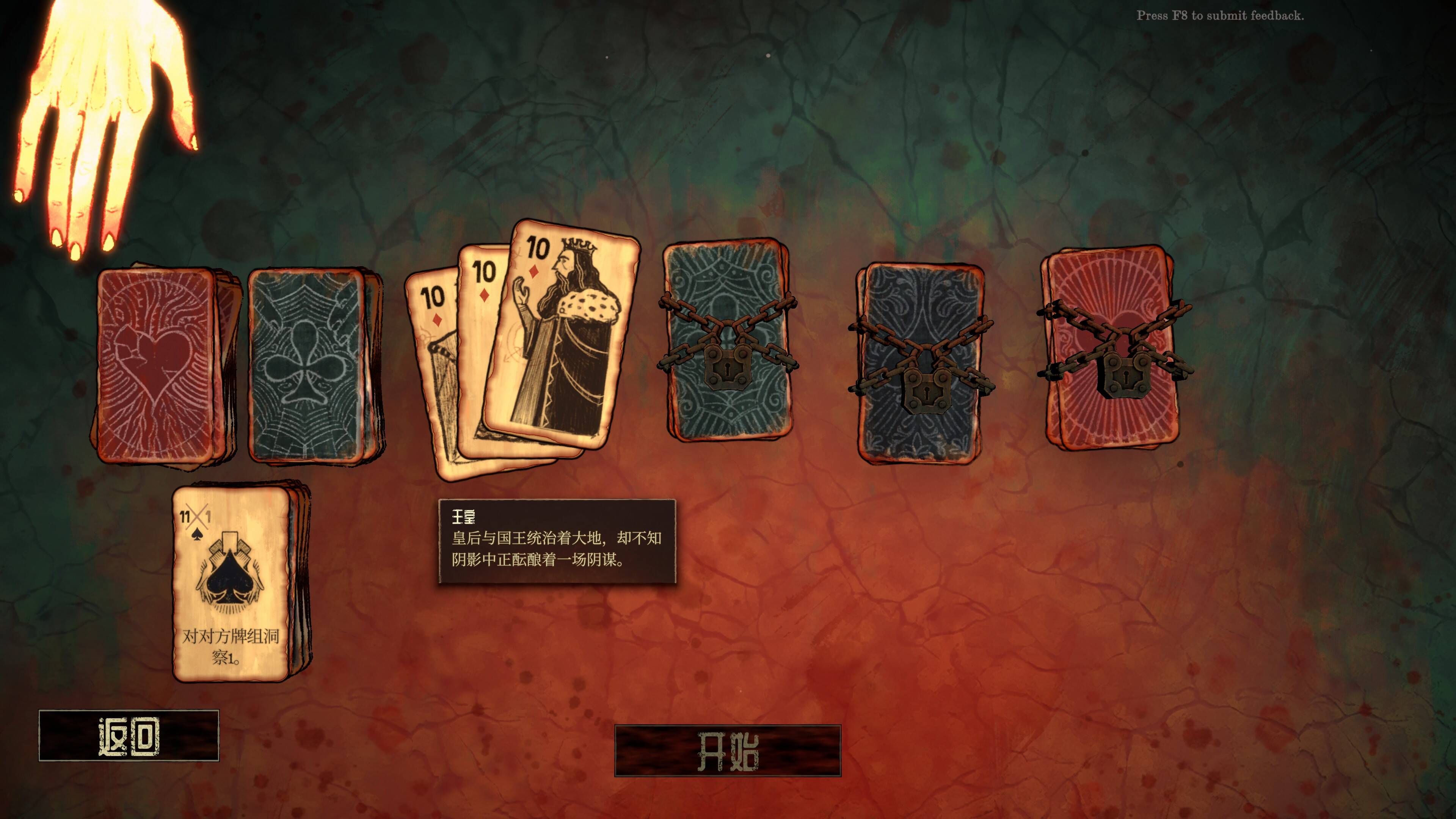 Demo版包含:完整教学、早期关卡随机探险、两位Boss“Ivel”和“Morgan”的挑战,四种基础花色和数十种遗物已开放。不过可惜的是人头牌目前只开放了一组固定的。