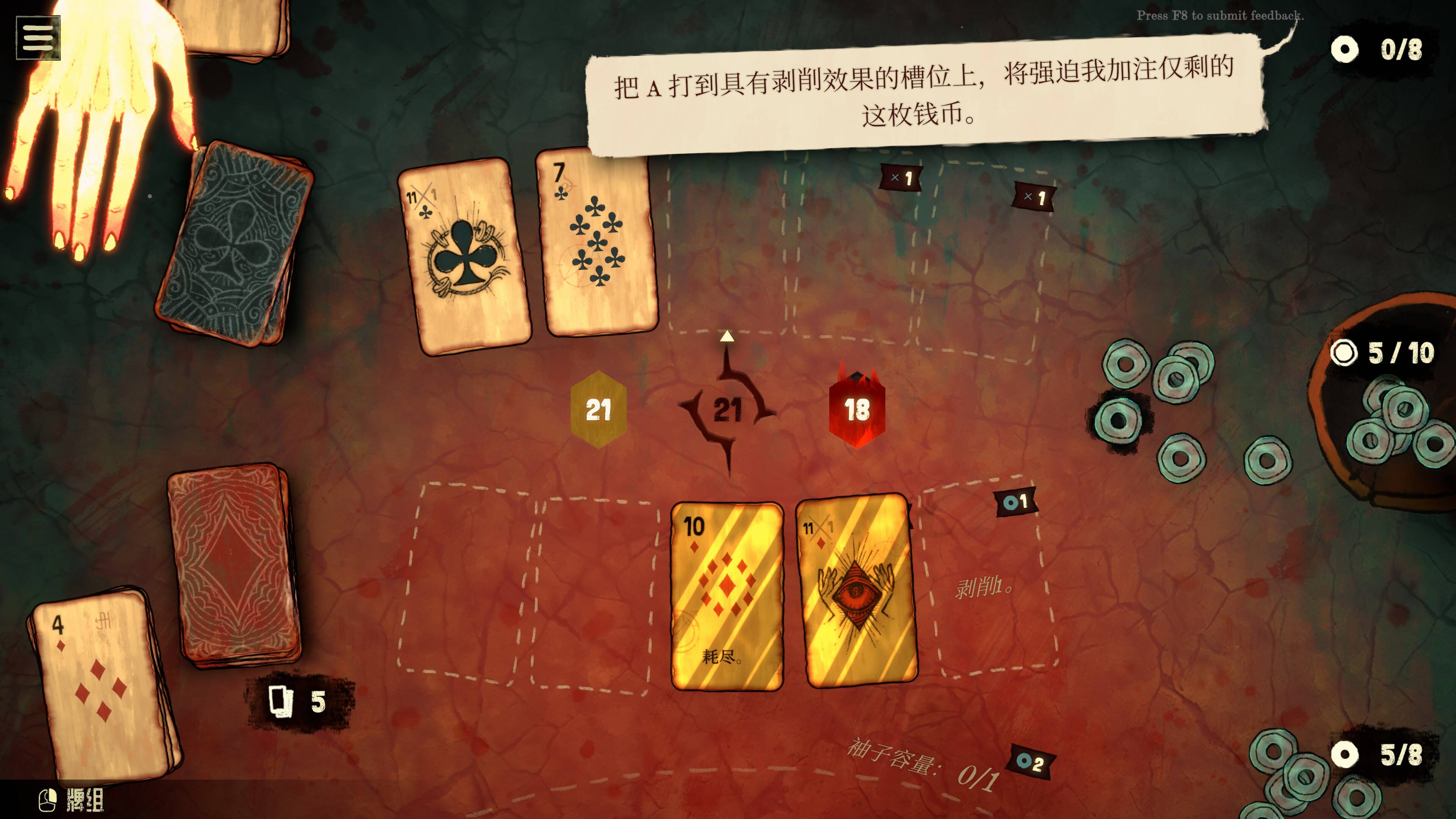 这种机制带来一个反直觉的认知:在《地狱黑杰克》,21点是个框,里面要去装下去的是玩家和游戏制作团队的想象力,靠各种各样的连锁反应与老千让对面在21点这个基础规则下输给你。