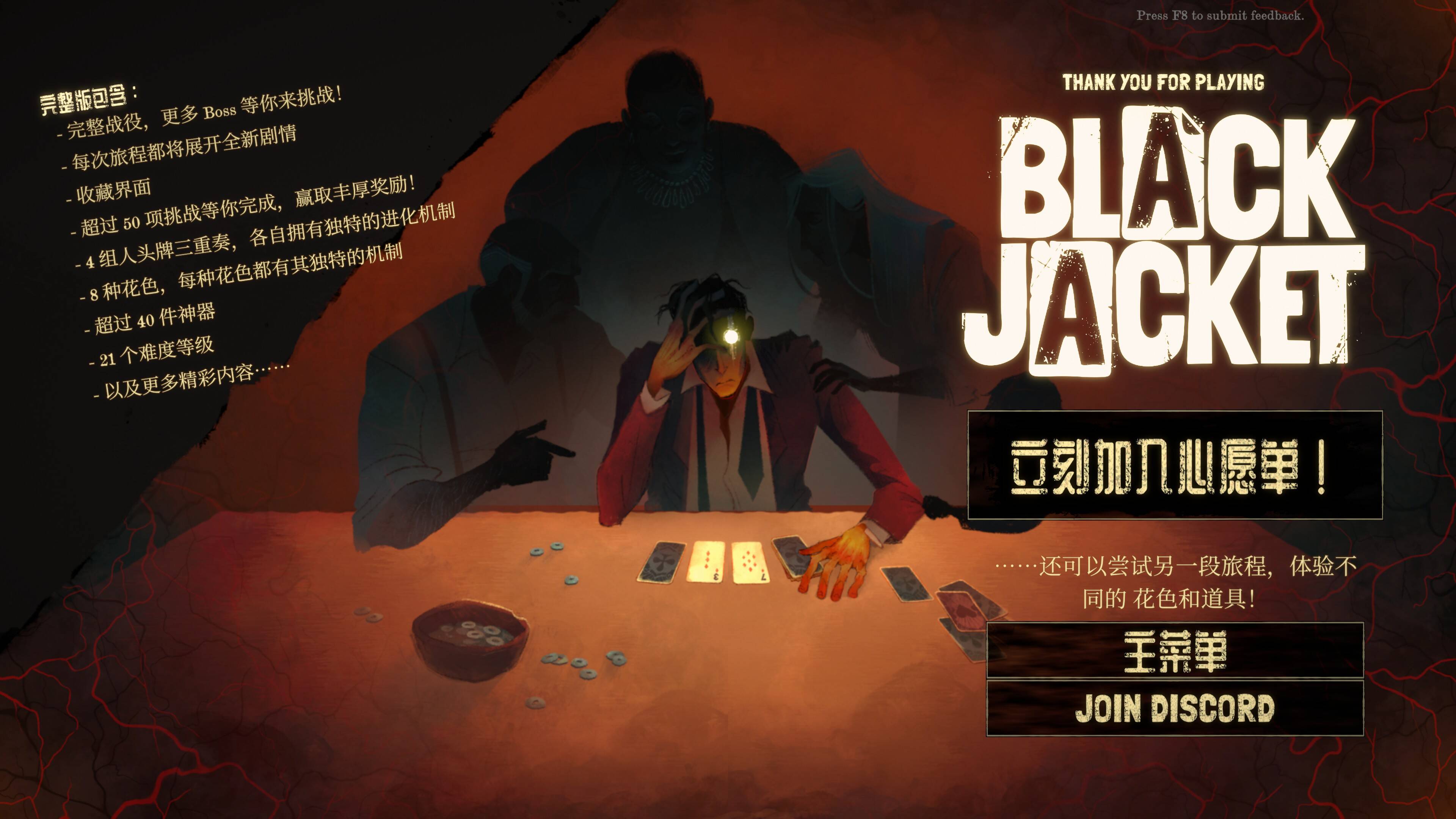 试玩版免费,Steam页面已挂出。建议先打两局,两局后你就大致了解这游戏了——它的底子是21点,但长出来的东西完全是另一回事。吸取了很多优秀前辈的部分特点,整合出来了他们自己的特色。Demo版可以体验到不少内容,推荐先加愿望单等正式版。
