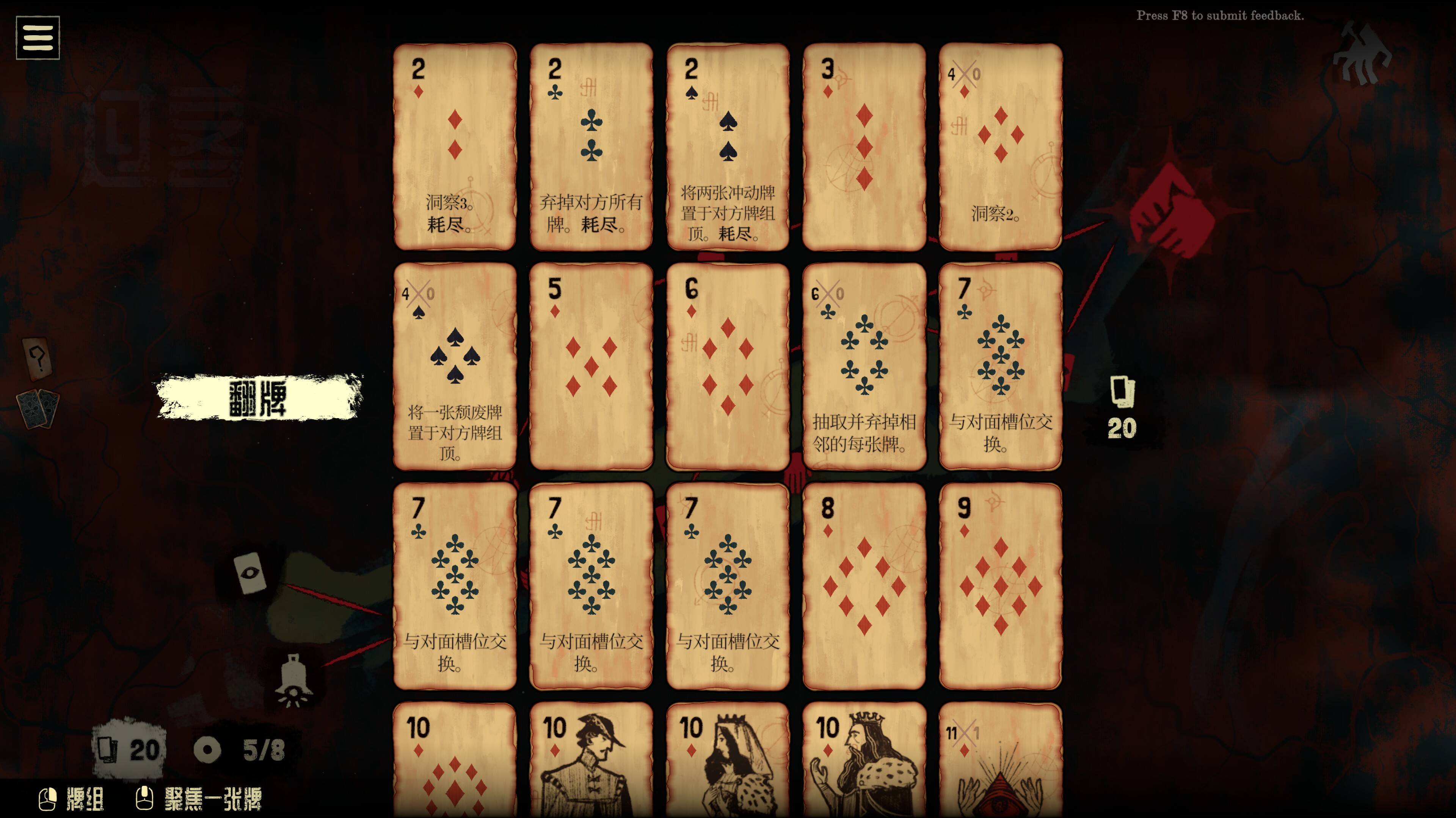 Demo版开放了四种花色,方片、黑桃、草花、红桃,每种的玩法逻辑完全不同,这个其实不用我多说,自己上手打几轮就能摸清楚。方片主要是预知和排序,交互性一般;黑桃可以加注,加快游戏节奏;草花和红桃更狠,直接冲着卡牌破坏来的。