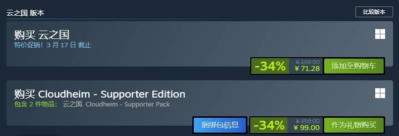 从 3 月 5 日起,《云之国》将正式开启限时特惠,全场享受 34% off的超值折扣! 值得关注的是,本次优惠活动也将无缝衔接备受瞩目的 Steam 春季促销。