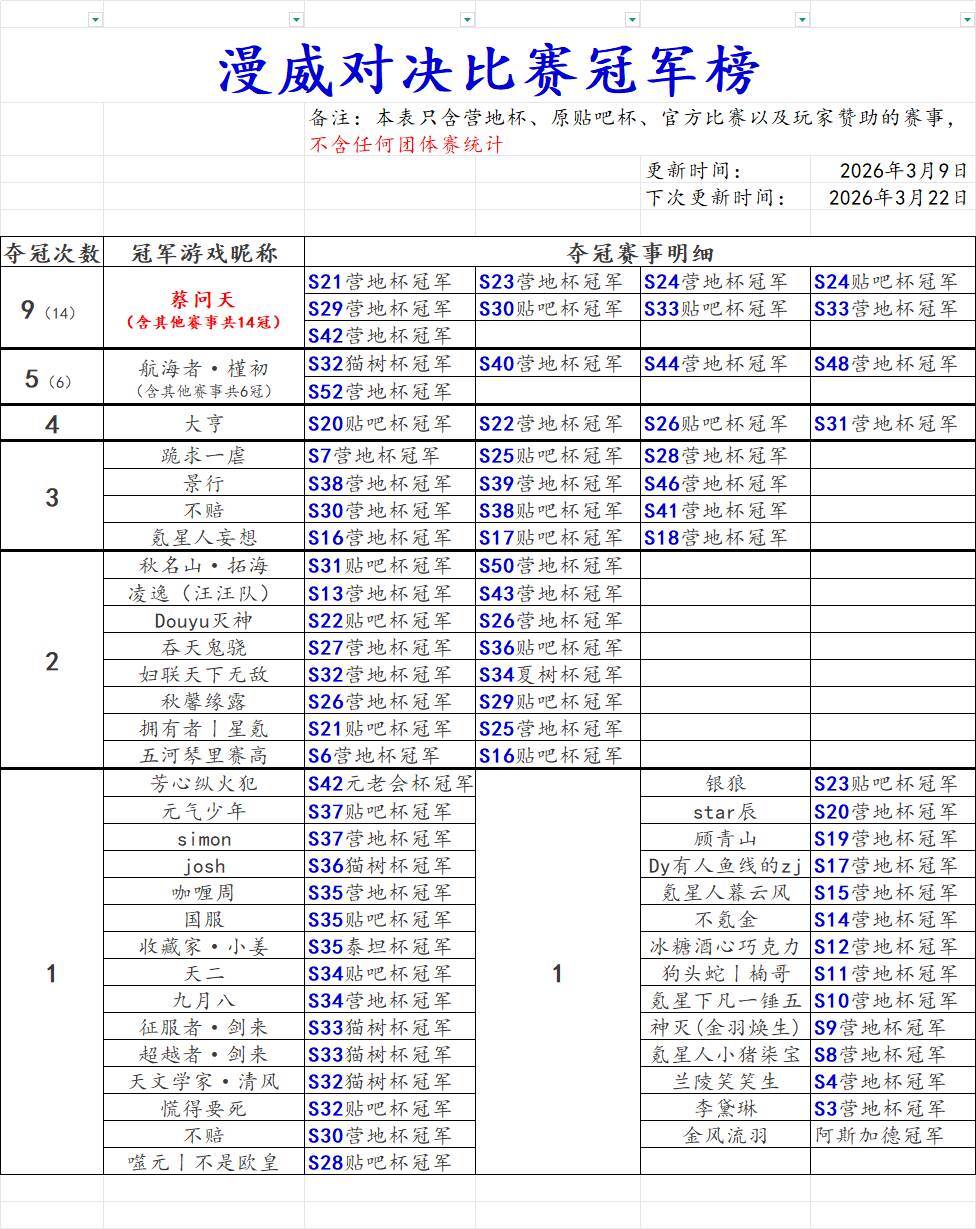 漫威对决赛事冠军榜(2026年3月9日更新)