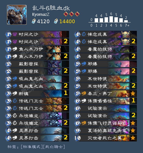 密探内战优先找dk本职业发现悼念,昨日之影等好牌,外战看压力找战士盾格过牌,牧师回血/过牌,萨满闪电风暴注意:当年炉石版本逻辑有触发顺序扳机,所以拍奥妮克希亚的时候要注意千万不要血量低于兆示级别,比如7血4兆示给8血消耗怪,这样丢不下去,预感血量极限请注意留刀这样可以砍回血上限。