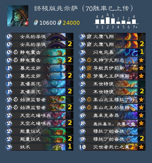 舍弃了笨重的343雷鸣流云及其卡手在前期过牌匮乏的情況下343和火鹰飞翔的配合显得很苛刻加入了010本身有野兽的词缀在三费空拍火鹰的情况下能免费打出buff的010节奏不是很亏 并且萨满的法术并不是很差