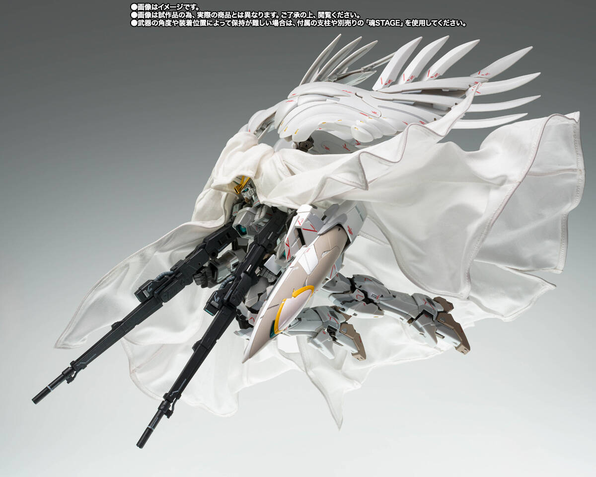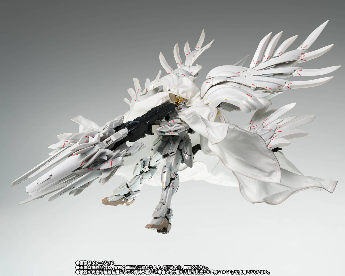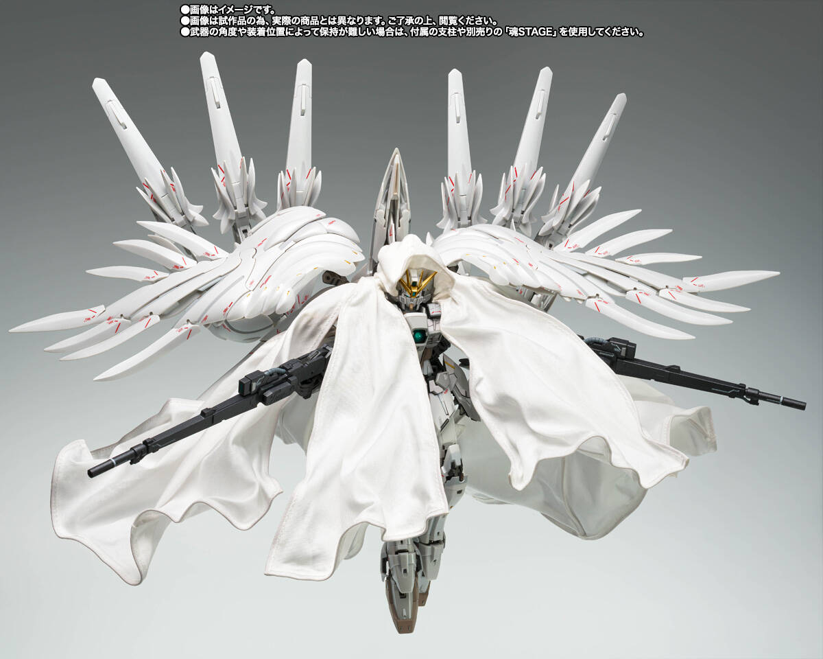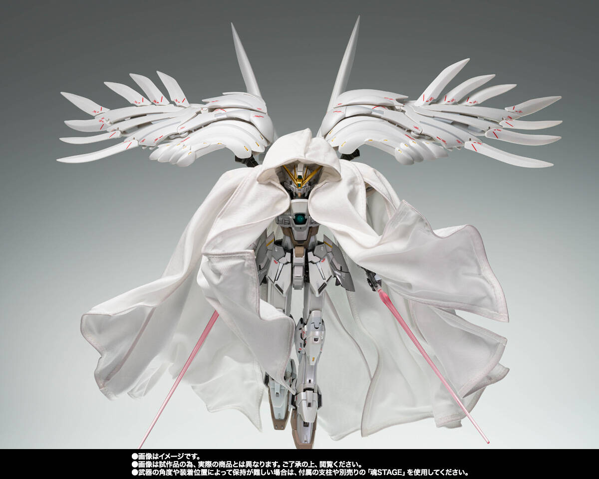 “飞翼零式高达CLOAKEDCUSTOM”在角木肇先生的监修下实现立体造型。影像中的粉色军刀也加以重现。“飞翼零式高达”以披风加身的全新造型呈现。