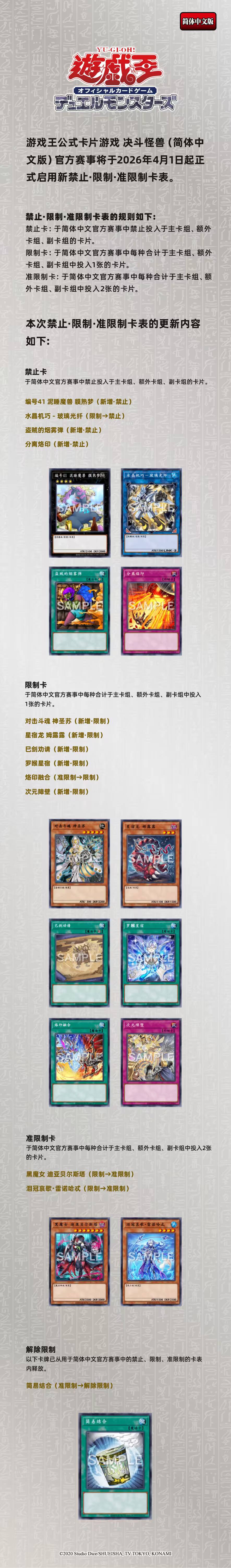 游戏王公式卡片游戏 决斗怪兽(简体中文版)官方赛事将于2026年4月1日起正式启用新禁止·限制·准限制卡表。