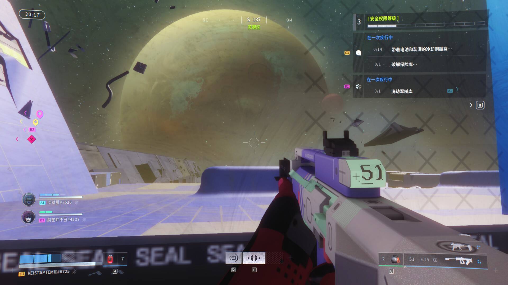接着聊聊地图。游戏共有四张地图:外围、恐怖沼泽、前哨和低温档案室。外围和恐怖沼泽是新手区域,主要展示殖民地风土人情。我认为和星空里的殖民星球差不多只能说是中等水平。而前哨则展示了游戏的真正野心。他们将本来用于pve的复杂地图改造一番后变成了一个pvp地图,而且还非常的好玩。前哨是一个活跃的UESC军事基地,布满探测器、安保机器人和环境危害,任何深入都可能引发激烈交火。而失控的天气生态系统会引发火雨,把户外区域化为炼狱,非常壮观。 。玩家需要搜集安全卡进入中心的塔状建筑“风轮”,这里藏有丰富战利品,同时是高频冲突的焦点。与其他PVP小图不同,马拉松通过安全卡数量限制和机制设计,让玩家在游玩时不像无头苍蝇。而通过各种捷径和通风管道,配合各种道具,让这张地图的战术也千变万化。此外,抬头可见马拉松号与天苍IV交错刚好会形成游戏的标志,也算是制作组的一个小巧思。