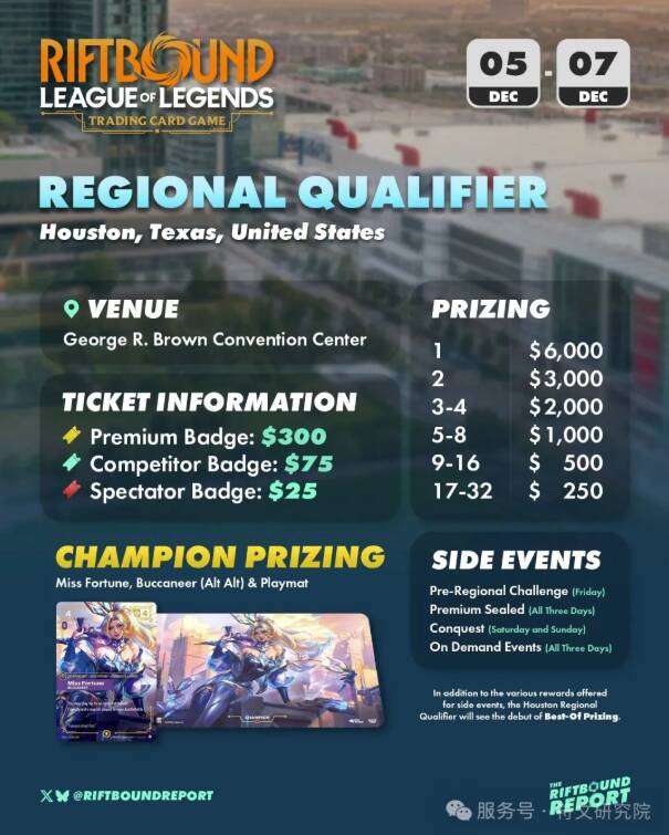 上图总结了休斯顿区域赛的基本情况。本场比赛的选手上限是1024人,报名费为75刀,豪华票300刀包含一盒补充包。奖品和国内比赛大致相同上位是同样的女枪赛卡,有一个额外的牌垫,但是前32强还有额外的现金奖励。