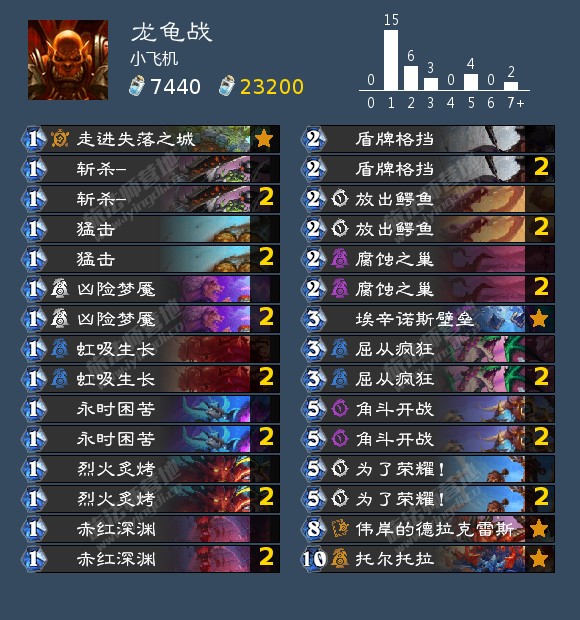 5费和5费以上:角斗开战绝对的核心,召的55老虎几乎可以忽略,为了荣耀!战士唯一好用的过牌,现在不管是灌注德还是T7猎都是铺场为主。卡组唯二的两个随从:伟岸的德拉克雷斯可以处理目前环境的所有场面(还能顺带A掉55老虎),托尔托拉无需多言,魔免大乌龟再用一费地标加个攻击力美滋滋。