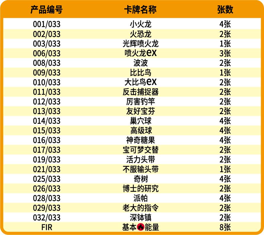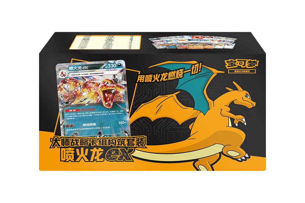 喷火龙ex款大师战略卡组构筑套装收录了一套精心构筑的喷火龙ex卡组。卡组内不仅有喷火龙ex、大比鸟ex、光辉喷火龙等强力宝可梦卡,还有派帕、友好宝芬、反击捕捉器等实用的训练家卡。如果你享受用高额的伤害绝地反击、一击制胜,喷火龙ex卡组就是你的不二之选。