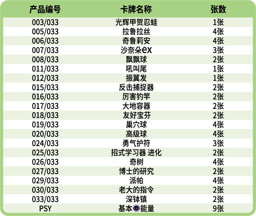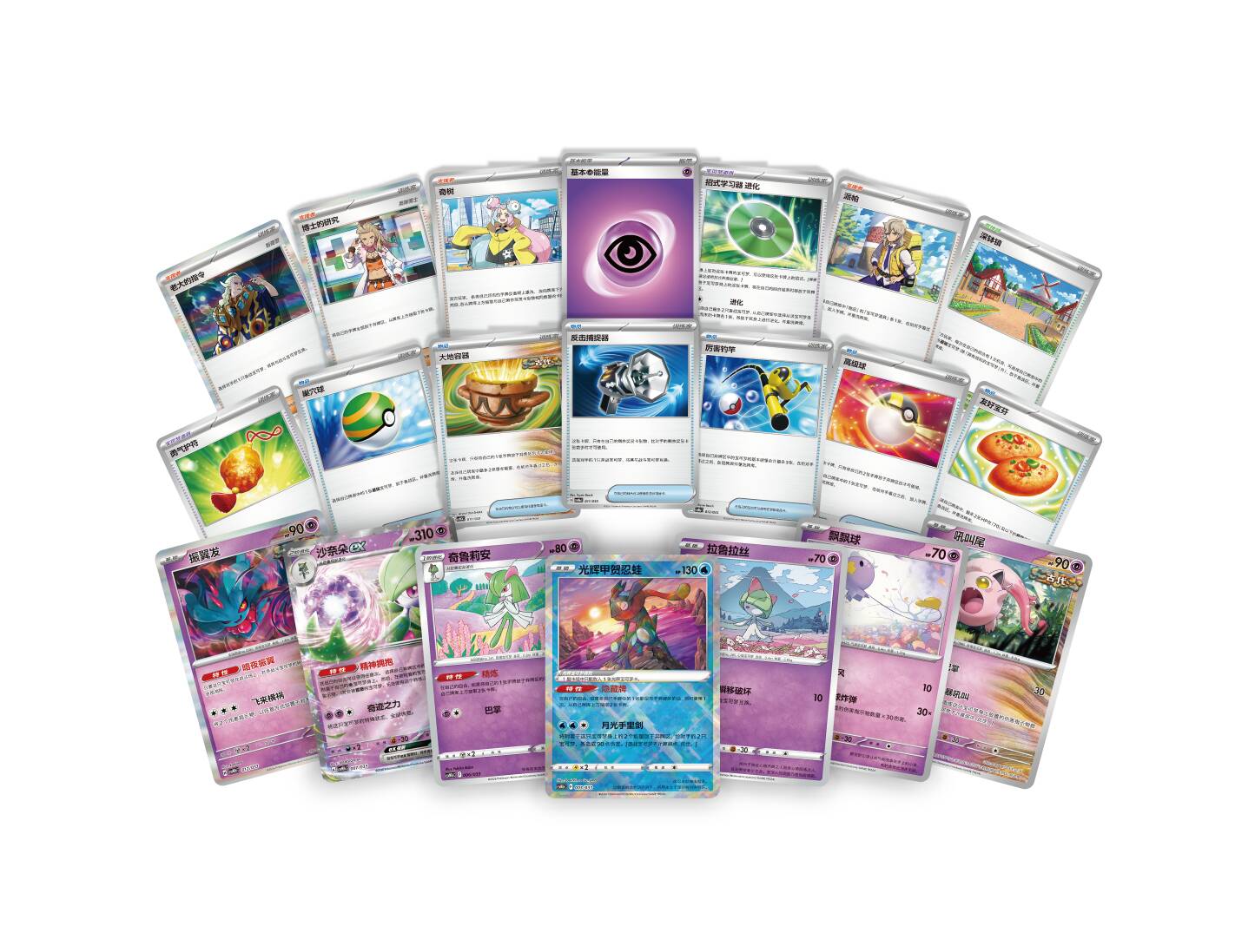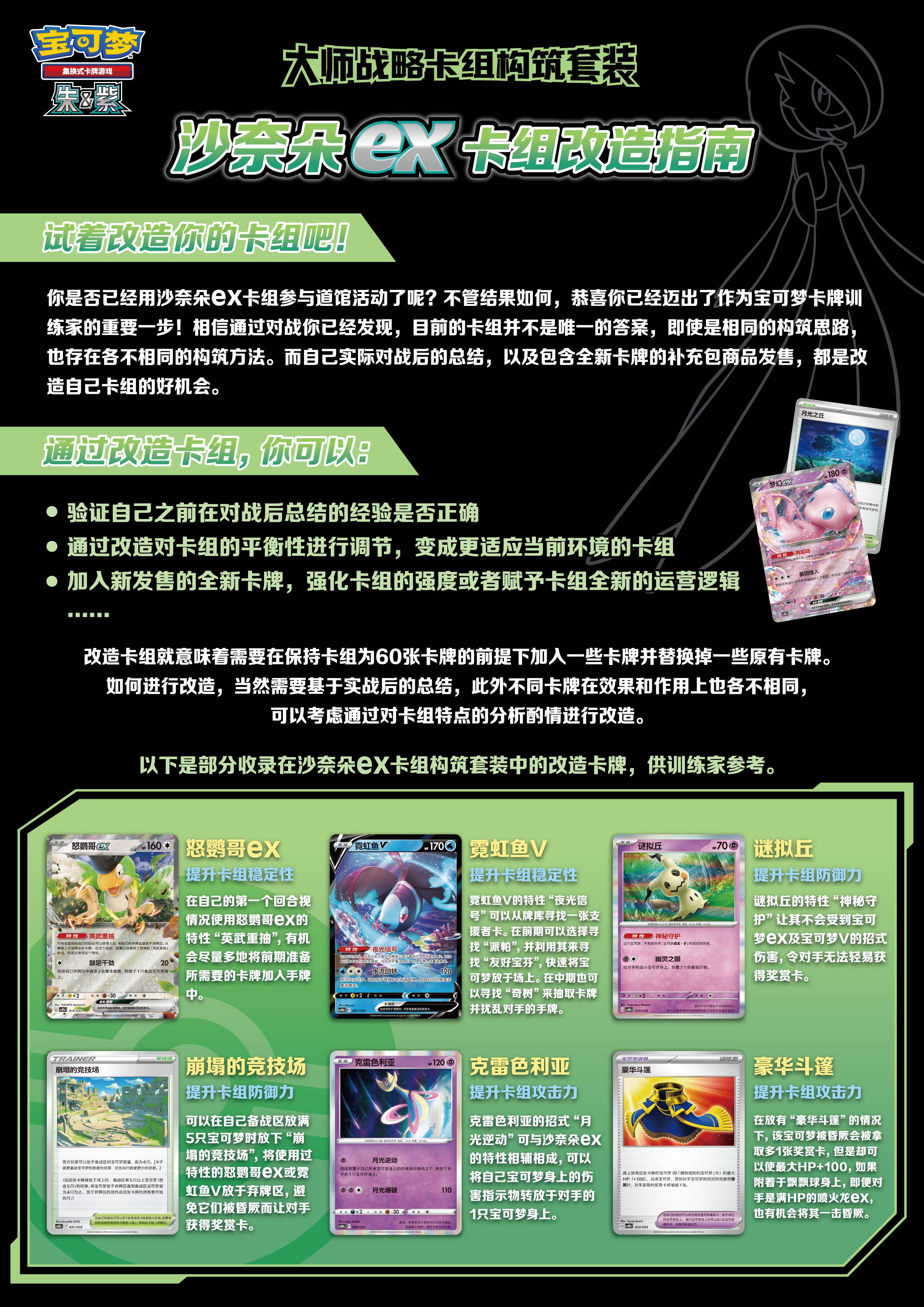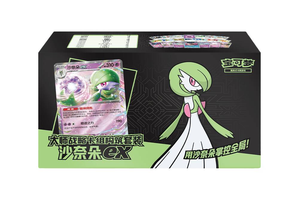 沙奈朵ex款大师战略卡组构筑套装收录了一套精心构筑的沙奈朵ex卡组。卡组内不仅有沙奈朵ex、飘飘球、光辉甲贺忍蛙等强力宝可梦卡,还有奇树、友好宝芬、大地容器等实用的训练家卡。如果你喜欢用精密的谋划和深远的战术步步为营、掌控战局,那沙奈朵ex卡组就是你最值得信任的搭档。