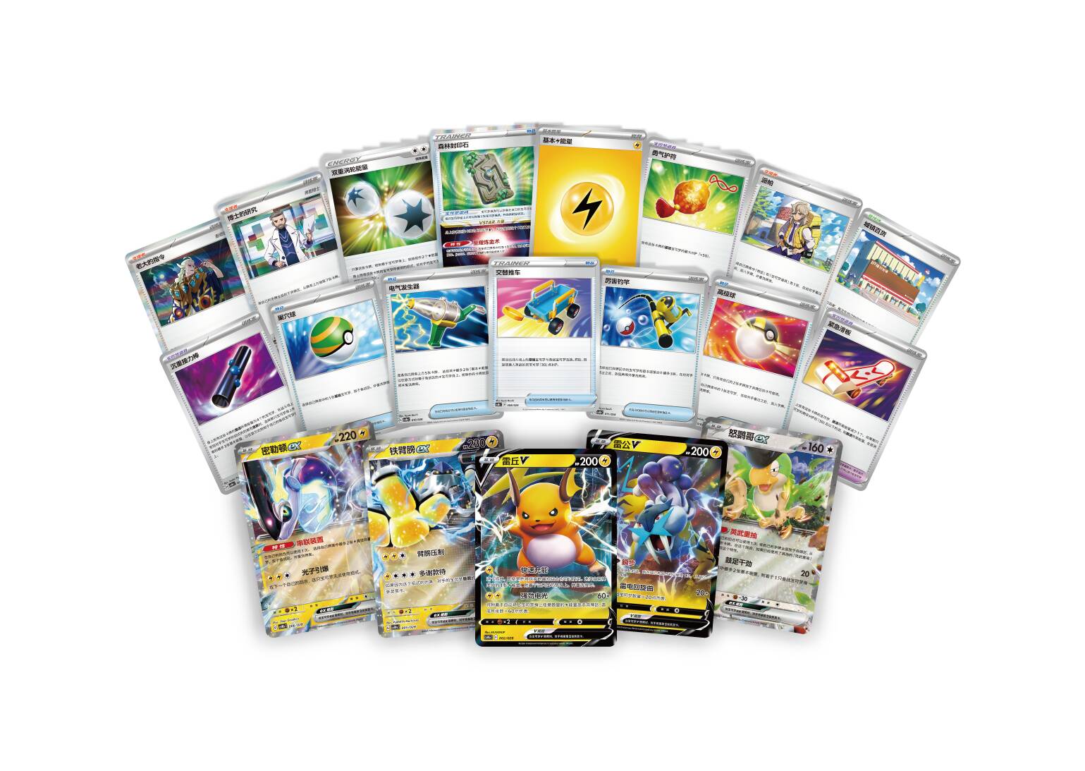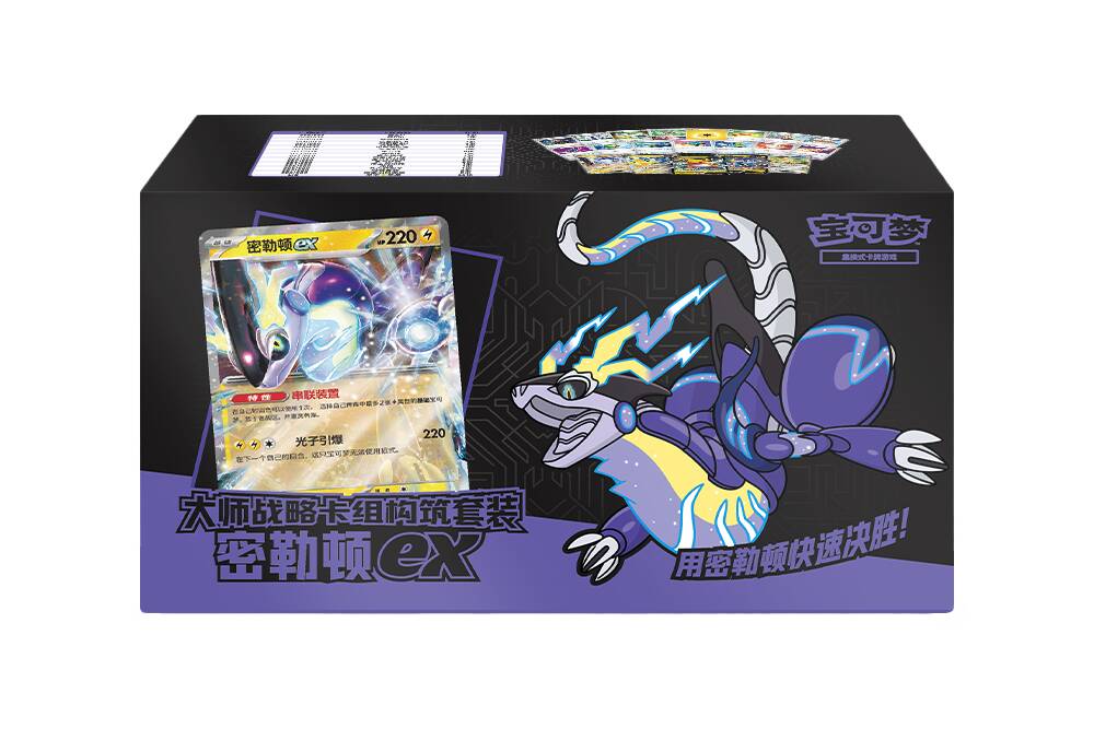 密勒顿ex款大师战略卡组构筑套装收录了一套精心构筑的密勒顿ex卡组。卡组内不仅有密勒顿ex、铁臂膀ex、雷公V等强力宝可梦卡,还有电气发生器、紧急滑板、森林封印石等实用的训练家卡。如果你相信唯快不破,决定以迅雷不及掩耳之势击溃对手,那就不要犹豫,选择密勒顿ex卡组。