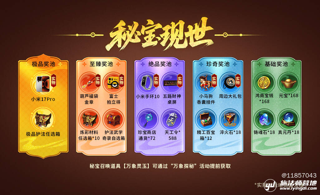 全民探秘,好礼满盈!全民探秘盛典开启,奇宝现世,福运临门。全新全民探秘玩法「万象探秘」掀起寻宝热潮,每日参与皆有惊喜,好礼连环送不停!全民皆可探秘,步步皆有收获——好运从此刻启程!从稀世珍藏到实物豪礼,丰厚奖励层层揭晓,少侠在参与日常活动中不仅可获得元宝、鸿商宝钱等奖励,在终极奖池开放后,还能参与抽取大奖:极品护法任选、炼彩外观材料、足金金章、拍立得、智能手环、护法武学奇录自选箱等多重豪礼你夺取!一场属于全服少侠的夺宝盛宴,即将点燃!