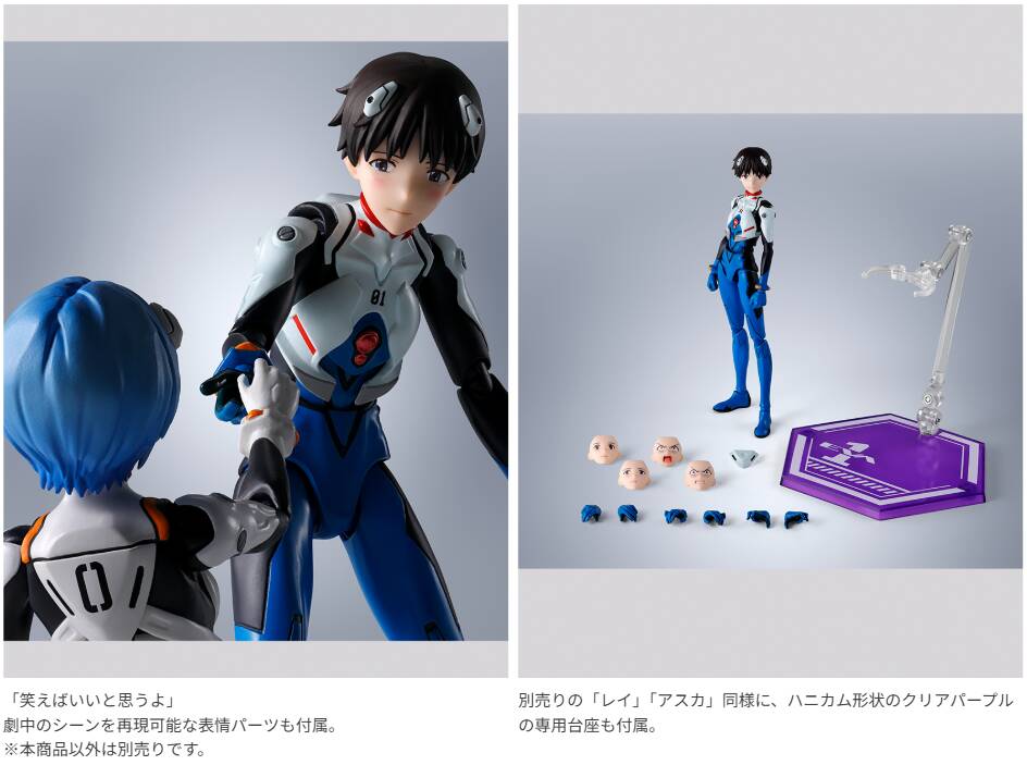 交換用表情パーツが4種付属した豊富なセット内容で、表情を交換することで様々なシーンを再現することが可能。更に、別売りの「S.H.Figuarts 綾波レイ」「S.H.Figuarts 式波・アスカ・ラングレー」と一緒に飾りやすいクリアパープルのハニカム形状の専用台座が付属。