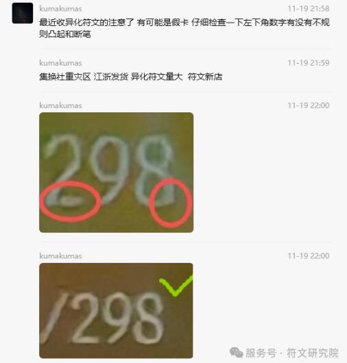 下面是群友提供的鉴别方法之一,下图字迹清晰的是正版,上图是假卡。