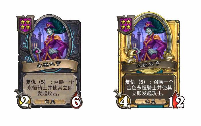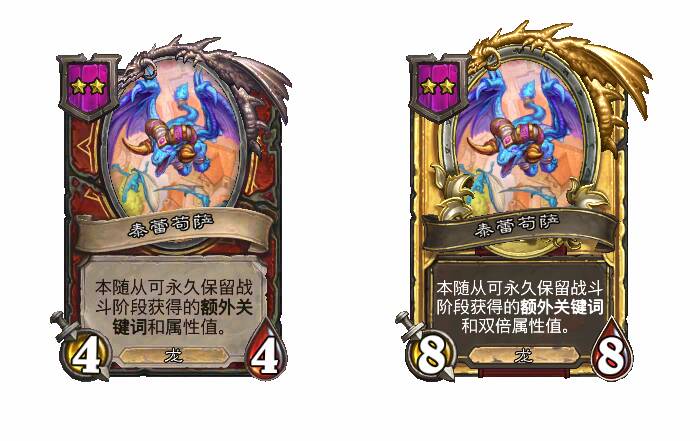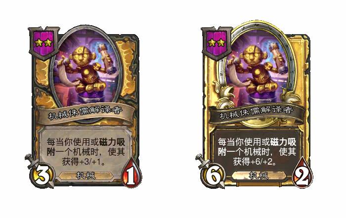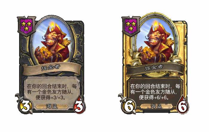 • 新:[3/3] 在你的回合结束时,每有一个金色友方随从,便获得+3/+3。(回调)