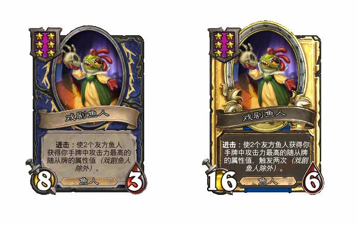 • 新:[8/3] 进击:使2个友方鱼人获得你手牌中攻击力最高的随从牌的属性值。(戏剧鱼人的除外)