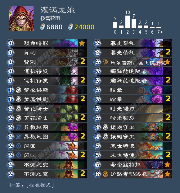 从胜率方面可以看出最劣的对局其实是内战,首先是盗贼内战比较拼胡,如果前期对面有1费闪回你很有可能就崩了,其次就是这套牌在打兆示贼等卡组时输暮光主母,因为对面有主母可以清我们的场,但是我们没有不能反清,而且我们这套主要以随从为主,很容易被主母反制。