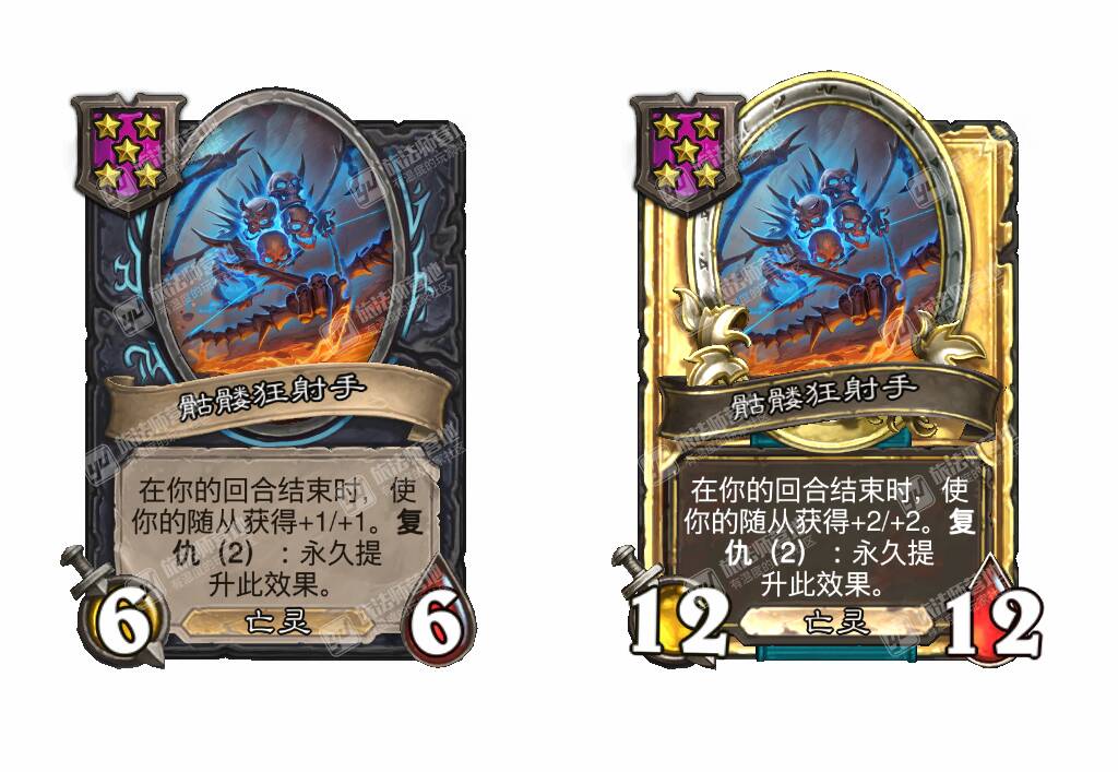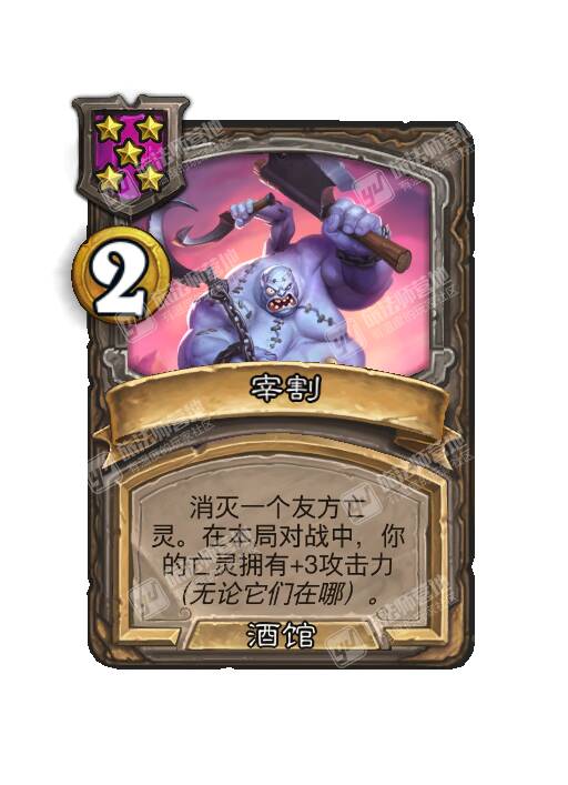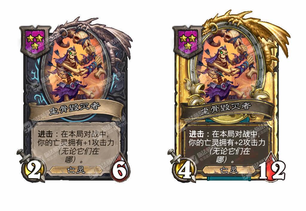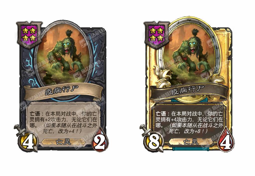 - [4星4/2亡灵] 亡语:在本局对战中,你的亡灵拥有+2攻击力,无论它们在哪。(如果本随从在战斗之外死亡,改为+4!)