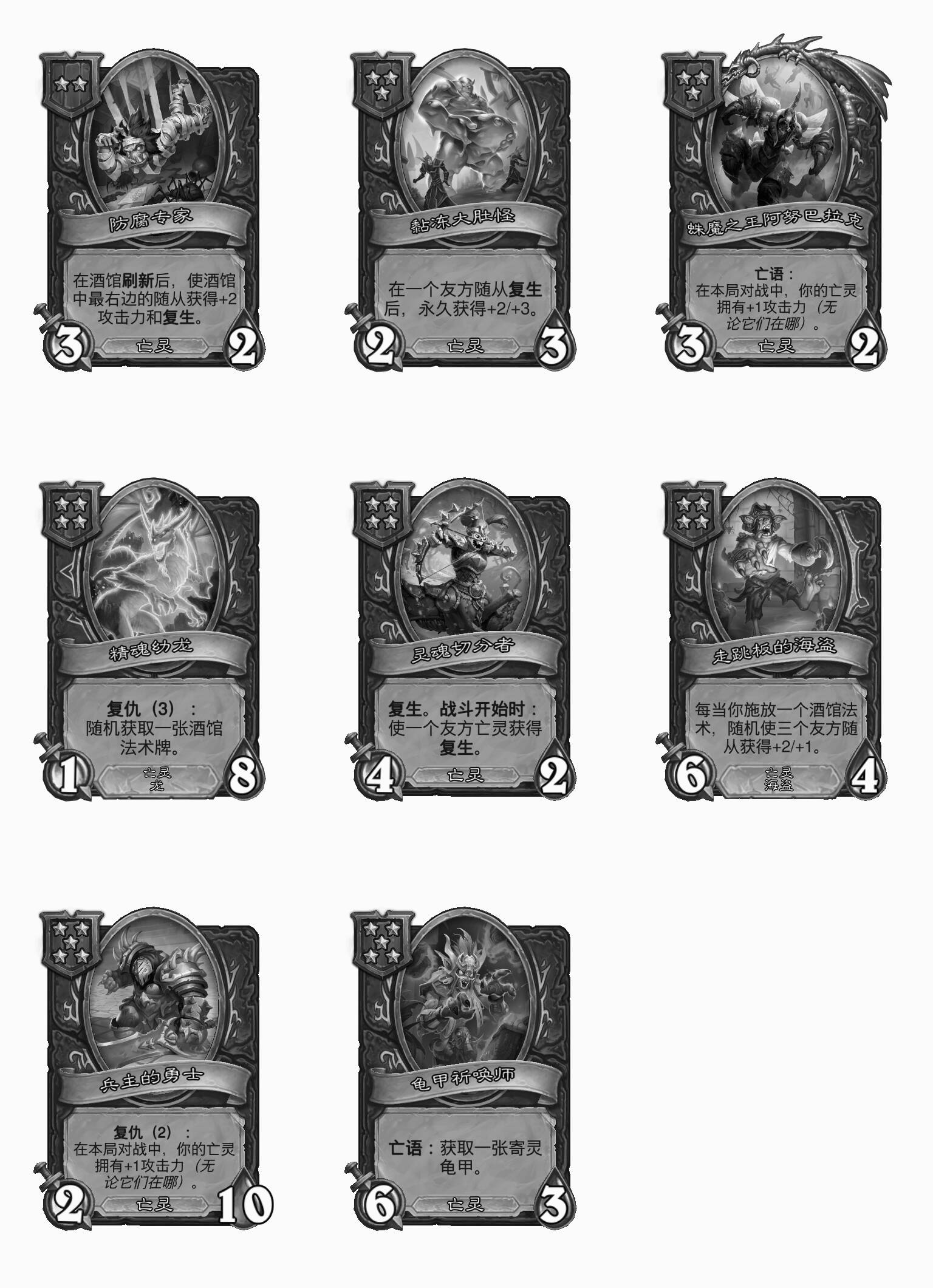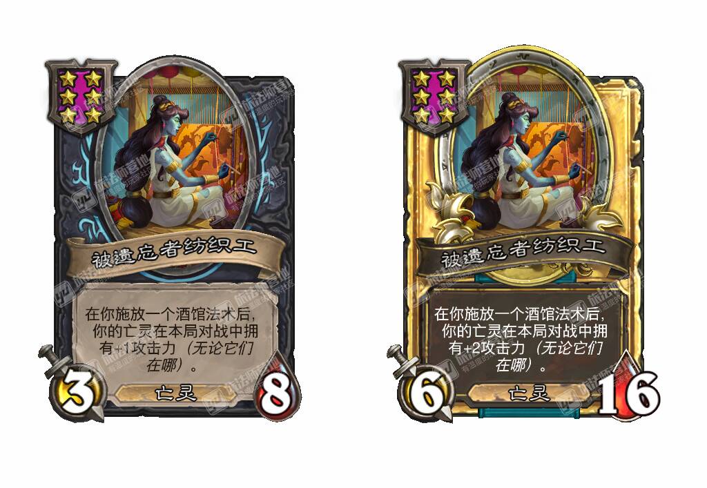 - 新:在你施放一个酒馆法术后,你的亡灵在本局对战中拥有+1攻击力(无论它们在哪)。