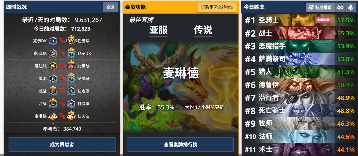 由于玩的不多,所以对战信息并没有记录下来,不过胜率还是很高,大致讲下对战思路吧,以当前天梯的出场率来讲下,为了便于直白的了解该卡组对战别的职业的胜率,我根据S,A,B 三个档位来标识(S为大优,B则为劣势)