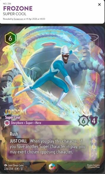 本次透露最令玩家疯狂的莫过于 Enchanted 版的 Frozone。Mike 对这张卡给出了极致的评价,将其艺术等级定为 S+。在画师 Juan Diego Leon 的笔下,Frozone 脚踏冰滑道俯冲而下的动感设计,不仅完美融合了卡牌的攻击力与意志值,更在视觉上营造出一种极具冲击力的力量感。