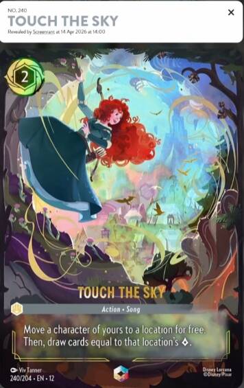 除了顶级的收藏卡,《Wilds Unknown》 在游戏机制上也带来了重大突破。以 Touch the Sky 为例,这张涉及 Mara 的 2 费可转化(inkable)卡片,允许玩家免费将角色移动至地点(location),并根据该地点的传说值抽牌。这种高效的资源转换能力,预示着它将在未来的竞技元环境(Meta)中占据核心地位。