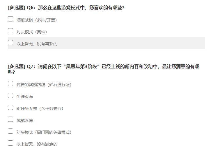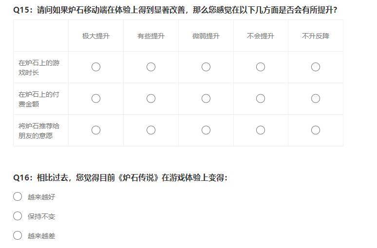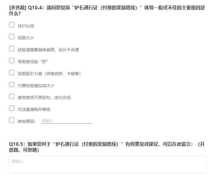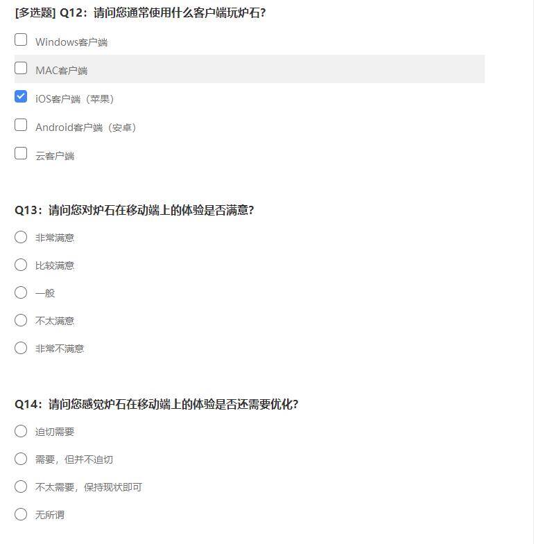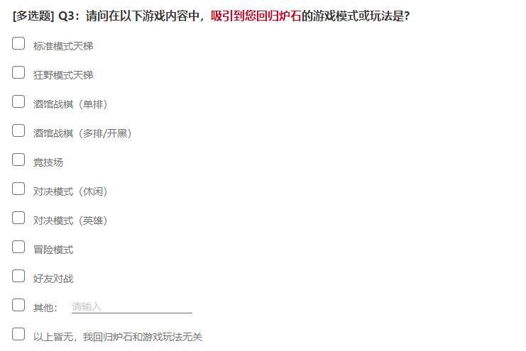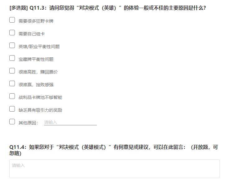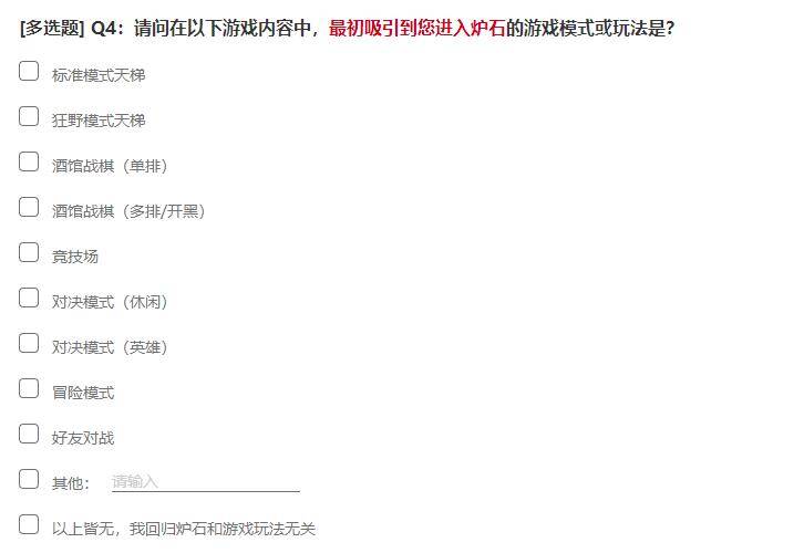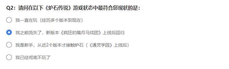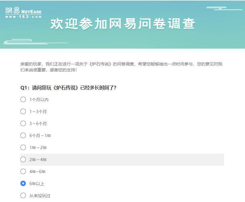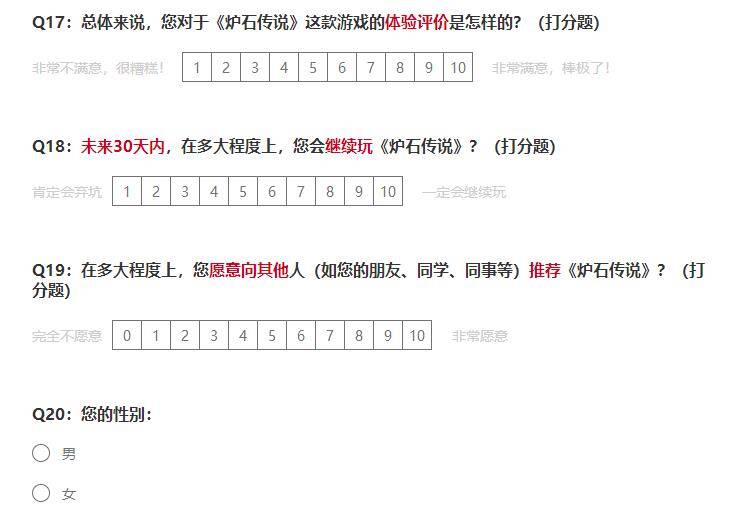 炉石官方调查问卷,链接:https://survey.163.com/htmls/9cno40/paper.html ,为了看看都问了啥穷尽了全部题目,大家参考。大家请根据自己的情况填写,把真实的想法反馈给暴雪,让炉石越来越好。