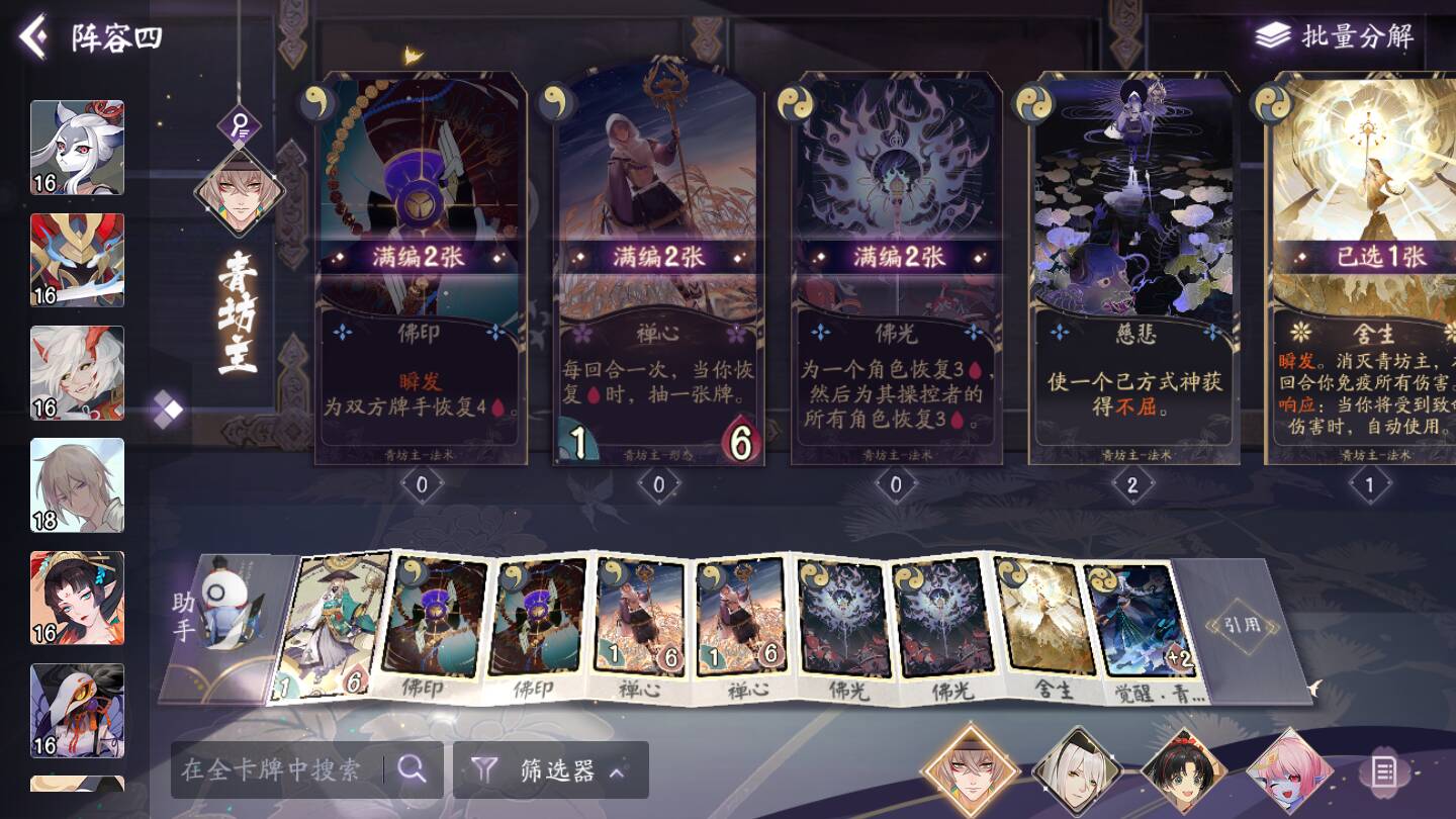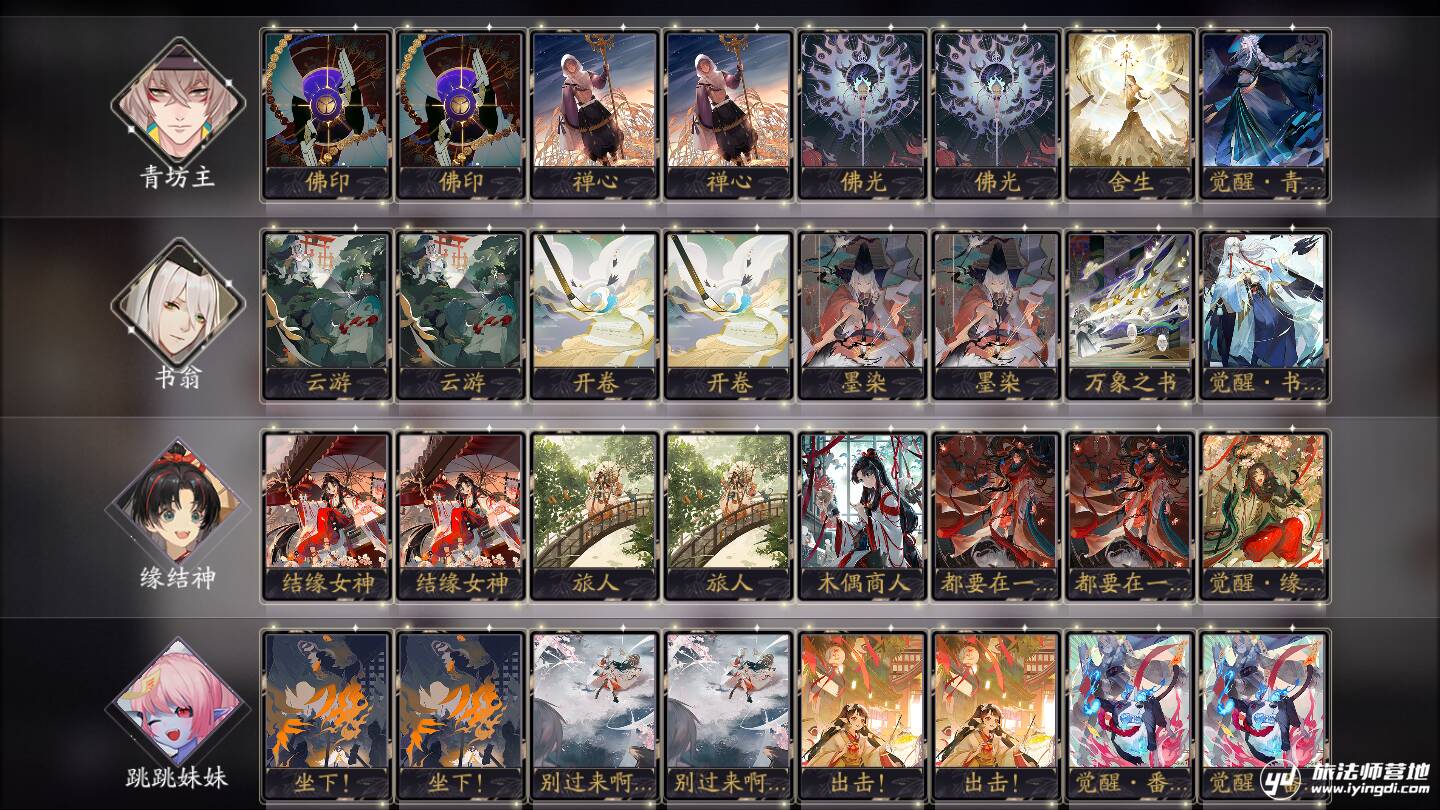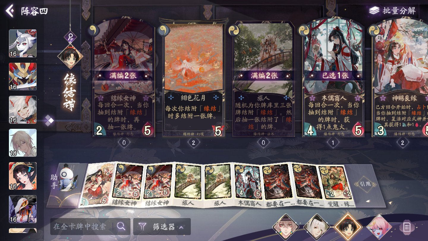 结缘女神:相当优秀的过牌形态,在觉醒和禅心的加持下,可以做到回合开始摸4牌,回16血,弹16点伤害。只要牌库有缘结,结缘女神就是真的神。