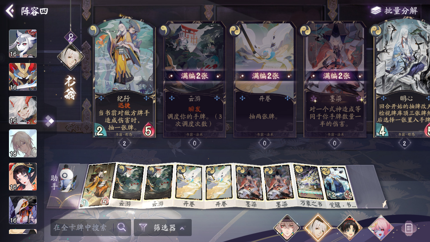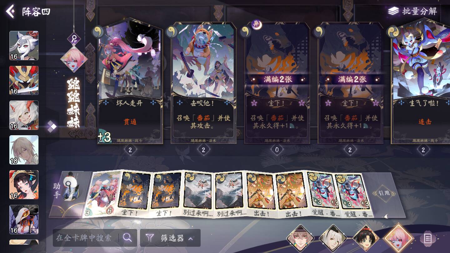 缘结神和青坊主保持血线并大量过牌,提高结附缘结的效率。书翁防止卡手和抽空,墨染唯一指定解场。跳妹兼任前期工具人和后期主力,打牌手和AOE一步到位。