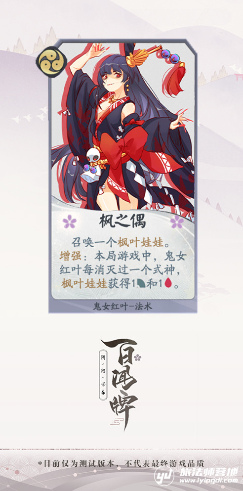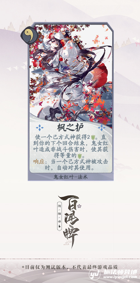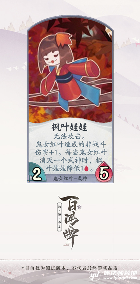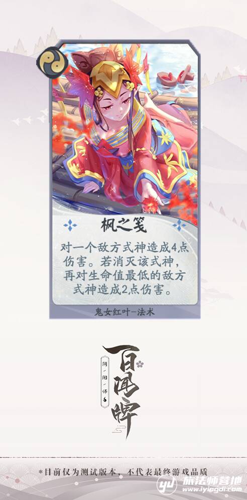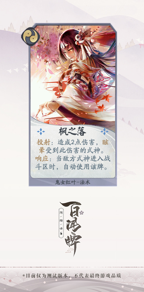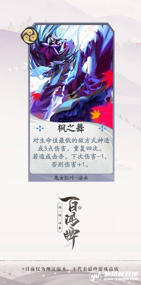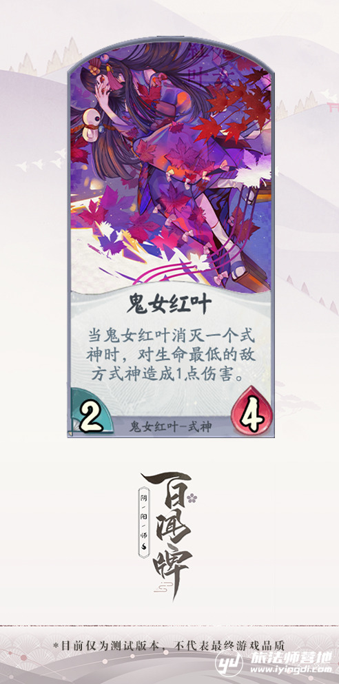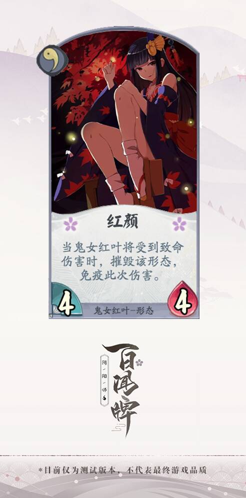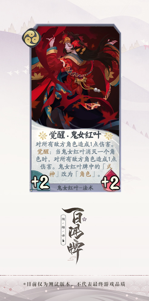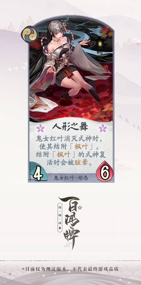 鬼女红叶是一个具有定向补刀能力的输出型式神,面对多个1血式神时还可自动连续补刀。当时打牌经常碰到一种尴尬的情况,就是对方后场式神残血,只有交出指向性法术才能解掉,但是会溢出很多伤害。红叶的基础能力**增加了对方在后场保留残血式神的风险。