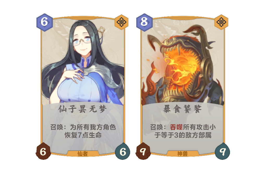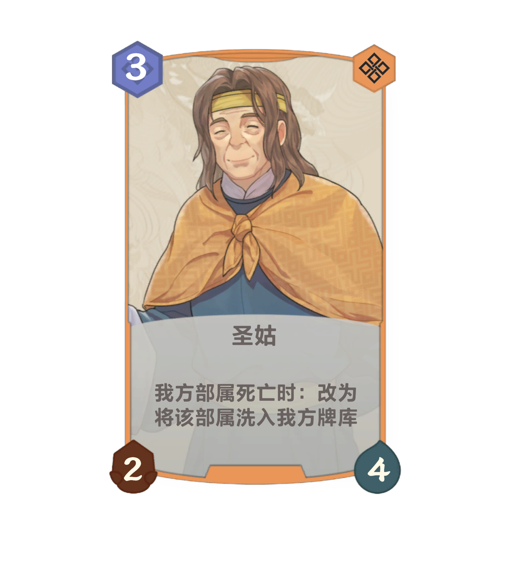 除了灵力消耗高这点,只有召唤时才能随机召唤一个敌方部属的复制,稍稍有点心痛;但没关系,我们还有圣姑,不要看圣姑老,但是能力可不弱,只要她在场,其他部署就没有后顾之忧,大不了圣妈把自己放回牌库再来一次嘛,对只有召唤时才有卡牌效果的牌简直不能再友好了,小苏愿意称之为亲妈!