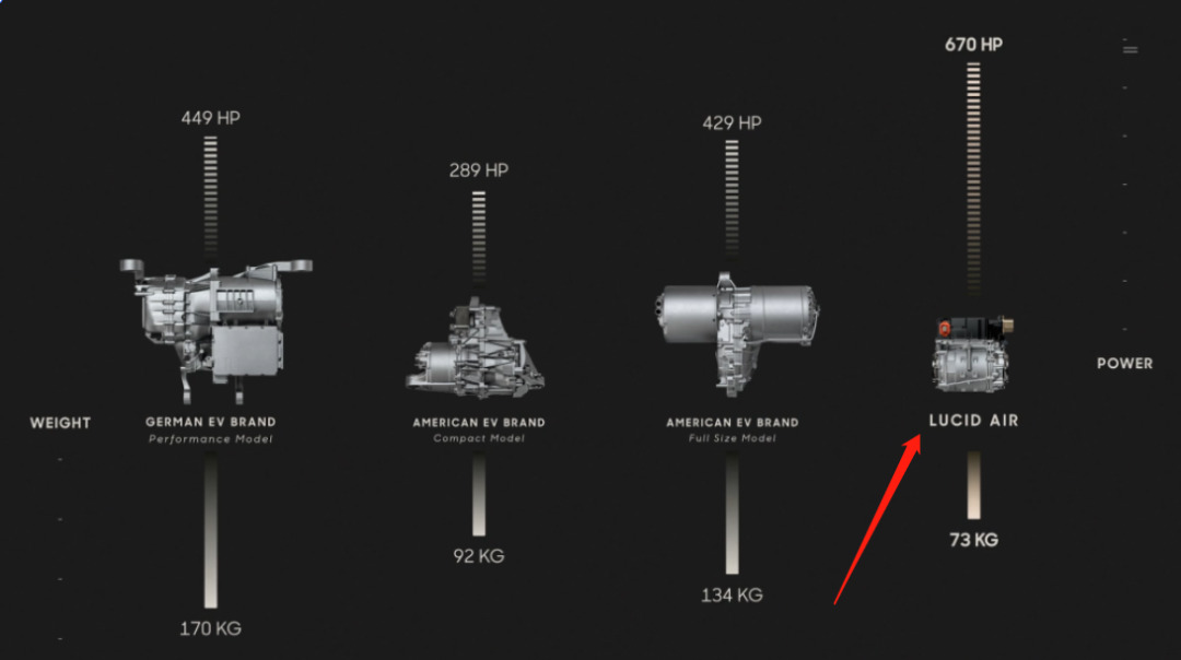 举个例子,他们在轿车 Lucid Air 上使用的电机体积就十分迷你。和其他品牌电机的大小对比,大概就是这样: