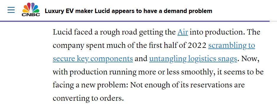 原因则是 Lucid 在 2022 年的时候花费了太多了精力去搞定零部件的生产和运输,导致耽误了做车。