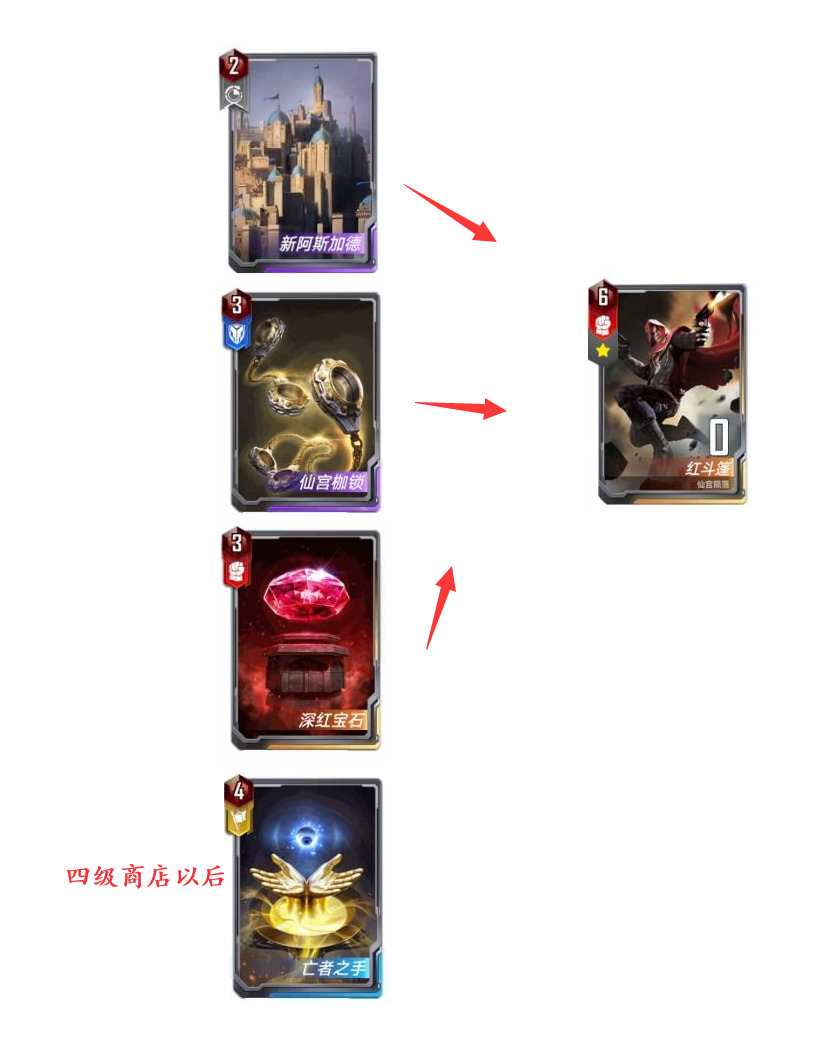 1、一般来说大部分时候都在第五回合升级到四级商店给红斗篷找仙宫陨落,如果你第三回合就已经找到猴子+红斗篷了,就可以提前上4,因为4级还有个蜘蛛秘闻可以拿。