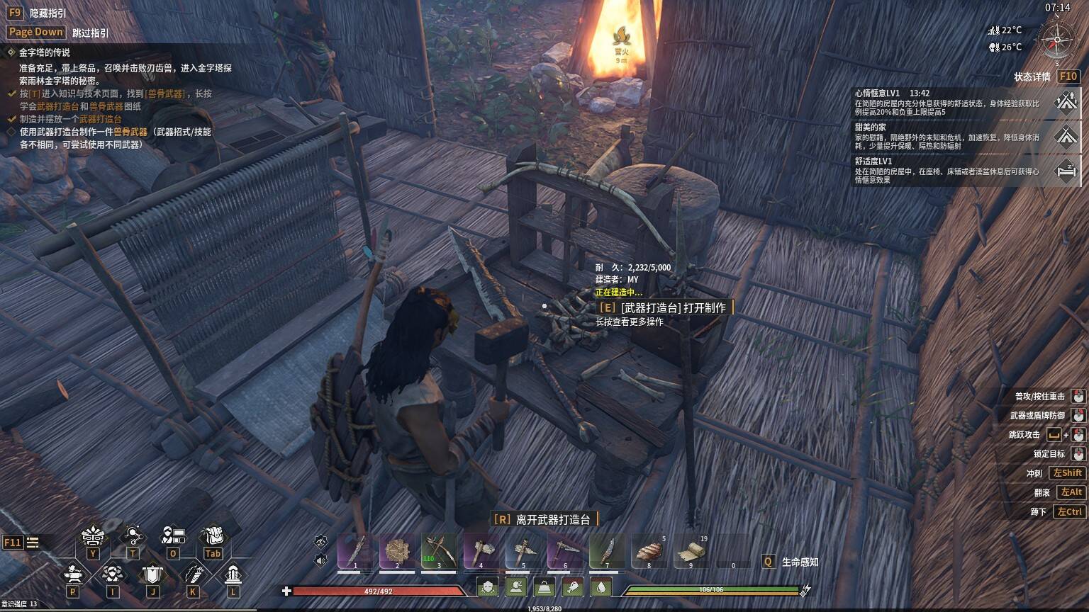 单人《灵魂面甲》体验下来,还是有不少诟病的点。角色升级系统相当复杂,玩家也需要从石器、骨器时代开始,逐渐发展到铁、钢。感受最深的一点是,工具台巨多,这让我的小房子里已经快放不下了,游戏采集、合成、制作都比较麻烦,虽然有野人“帕鲁”可以帮忙工作,但相当繁琐的各种流程也依然让玩家负担比较大。有一个可以设置箱子存放种类的小细节,非该种类不能存放,看到有玩家很喜欢这个设计,但我确实不太会用,这样极其繁杂的各种物品让我玩着有些头痛。